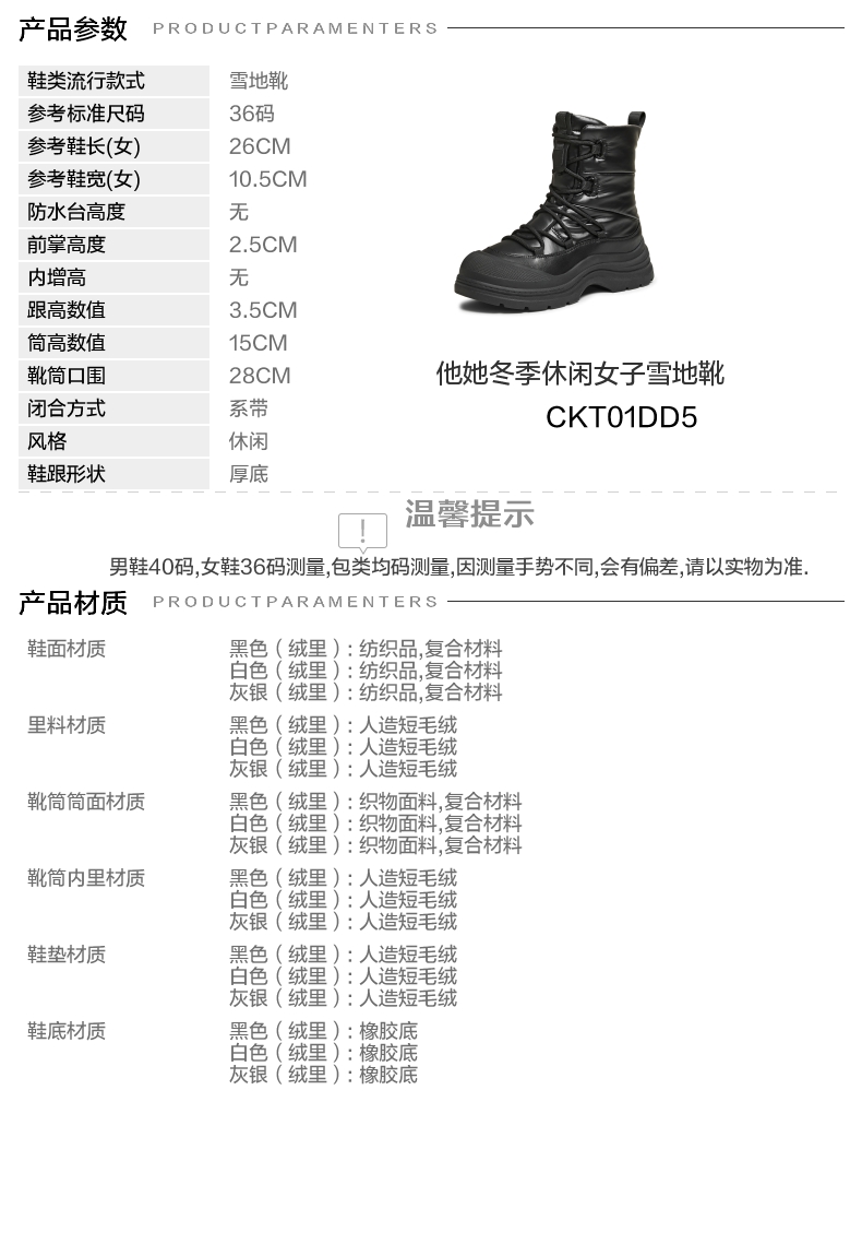 | 参考鞋宽(女):10.5CM | 风格:休闲 | 色系:黑色 | 跟高数值:3.5CM | 筒高数值:15CM |