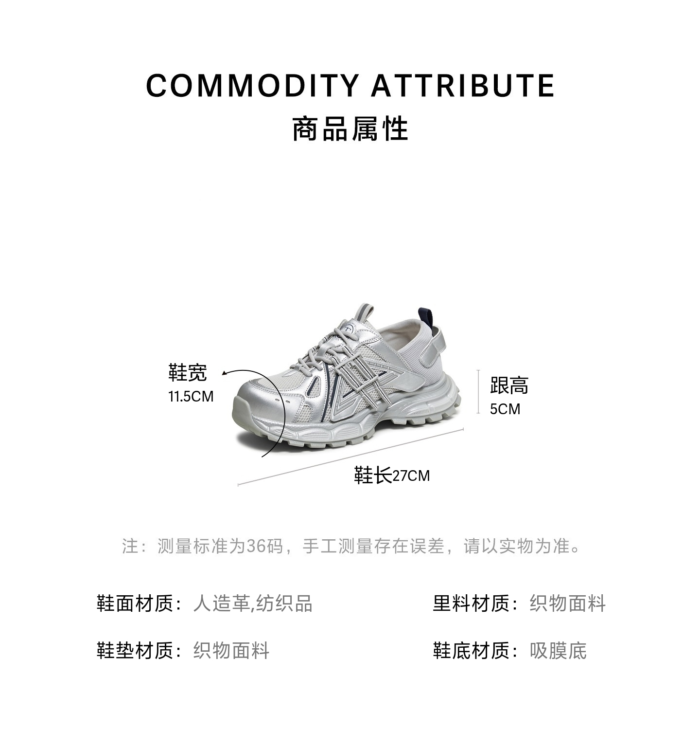| 色系:银色 | 跟高数值:5CM | 适用人群:女子 | 性别:女子 | 里料材质:织物面料 |