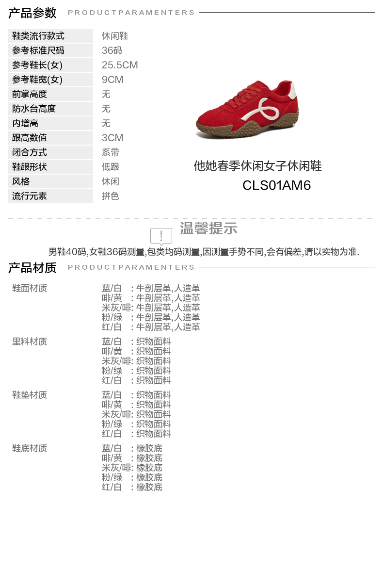 | 鞋跟形状:低跟 | 参考鞋长(女):25.5CM | 流行元素:拼色 | 参考鞋宽(女):9CM | 风格:休闲 |