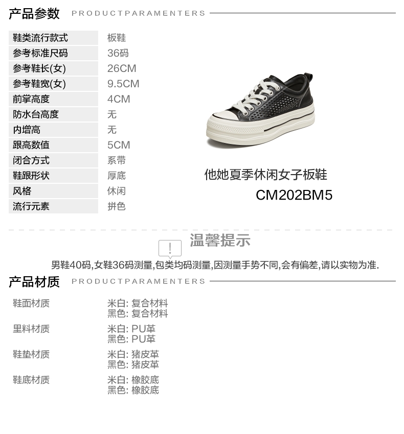 | 鞋跟形状:厚底 | 参考鞋长(女):26CM | 流行元素:拼色 | 参考鞋宽(女):9.5CM | 风格:休闲 |