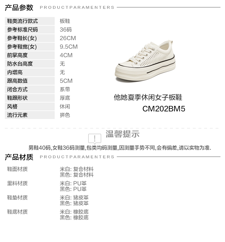| 鞋跟形状:厚底 | 参考鞋长(女):26CM | 流行元素:拼色 | 参考鞋宽(女):9.5CM | 风格:休闲 |