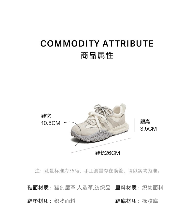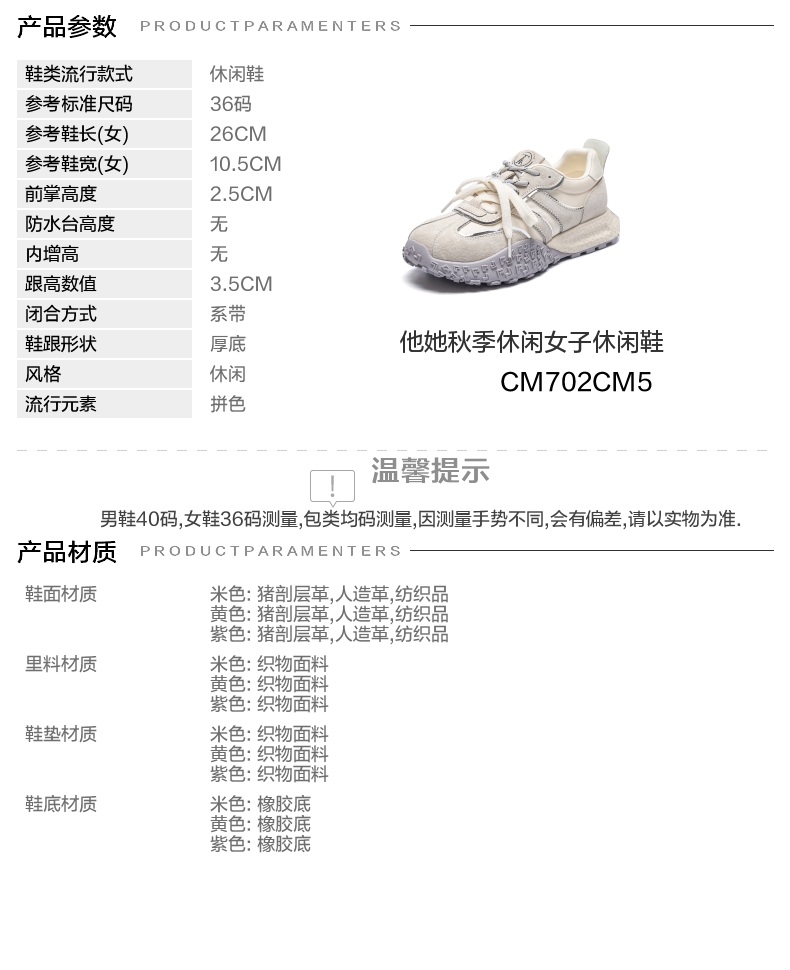 | 鞋跟形状:厚底 | 参考鞋长(女):26CM | 流行元素:拼色 | 参考鞋宽(女):10.5CM | 风格:休闲 |