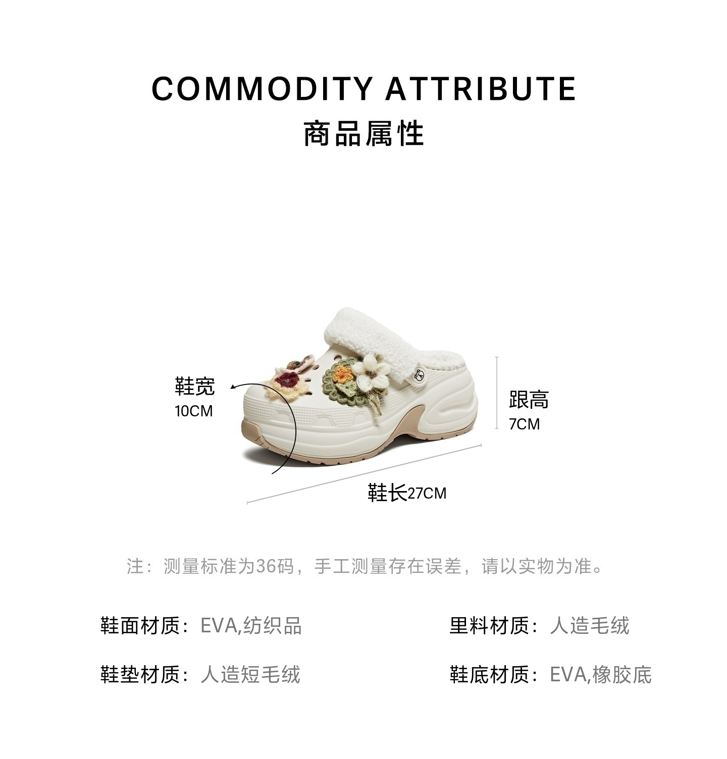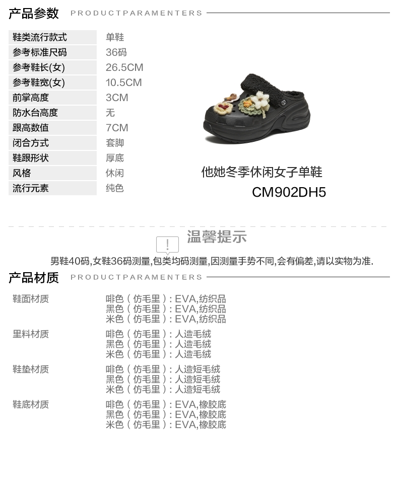 | 跟高数值:7CM | 色系:黑色 | 配跟:无 | 性别:女子 | 里料材质:人造毛绒 |