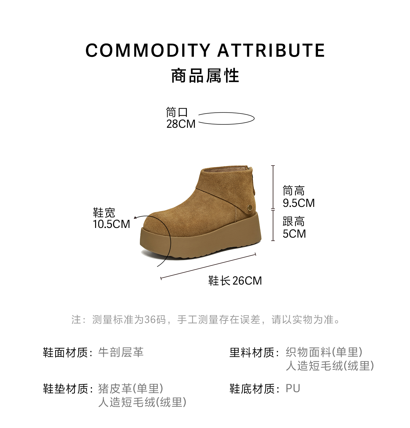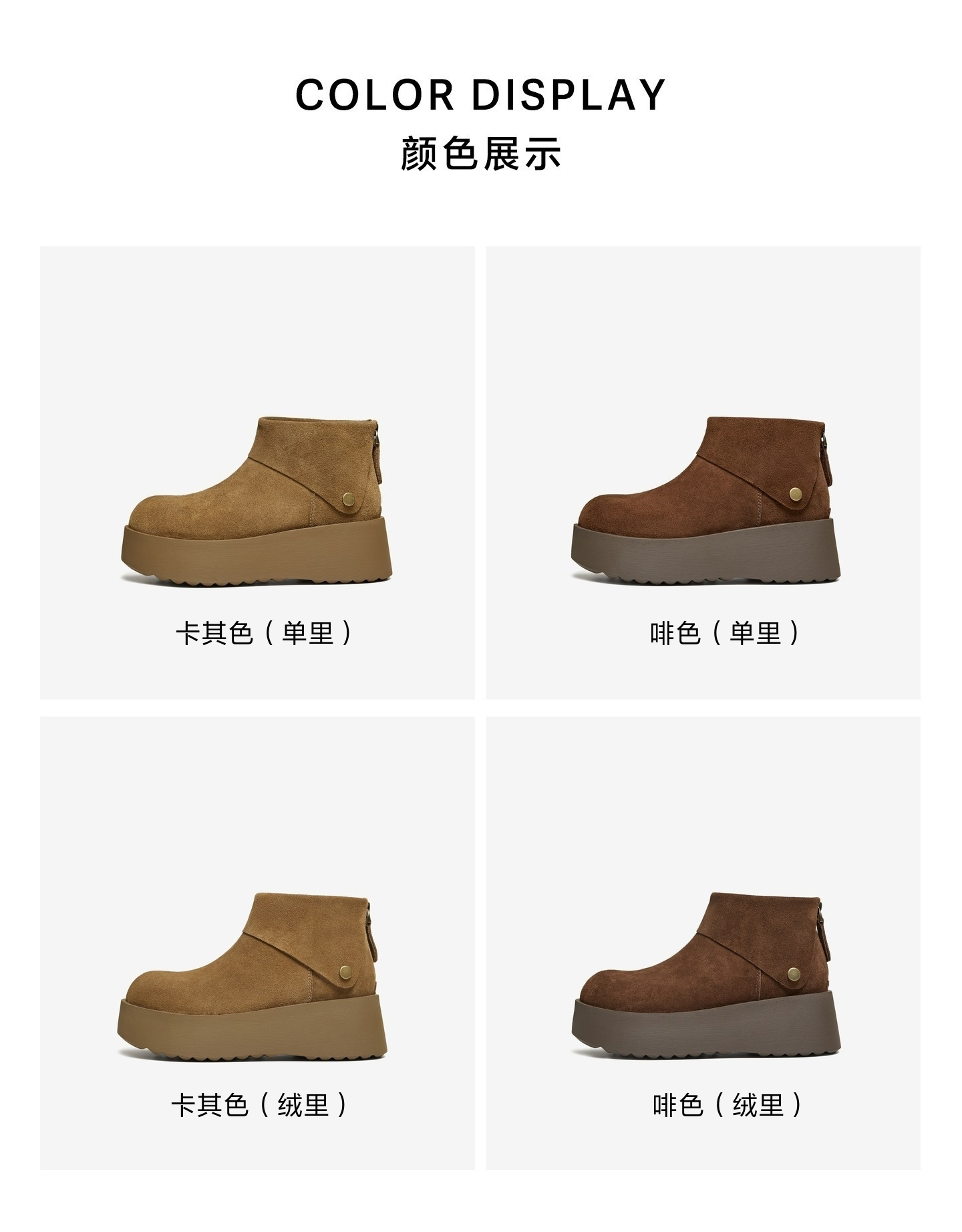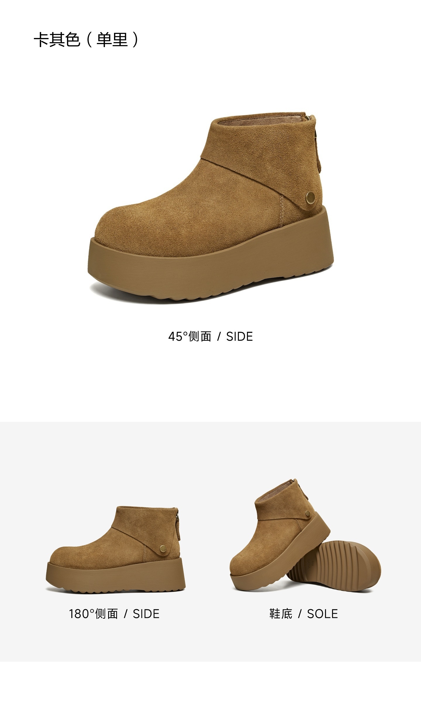 | 鞋底材质:PU | 靴筒内里材质:织物面料 | 内增高:无 | 鞋面材质:牛剖层革 | 闭合方式:后拉链 |