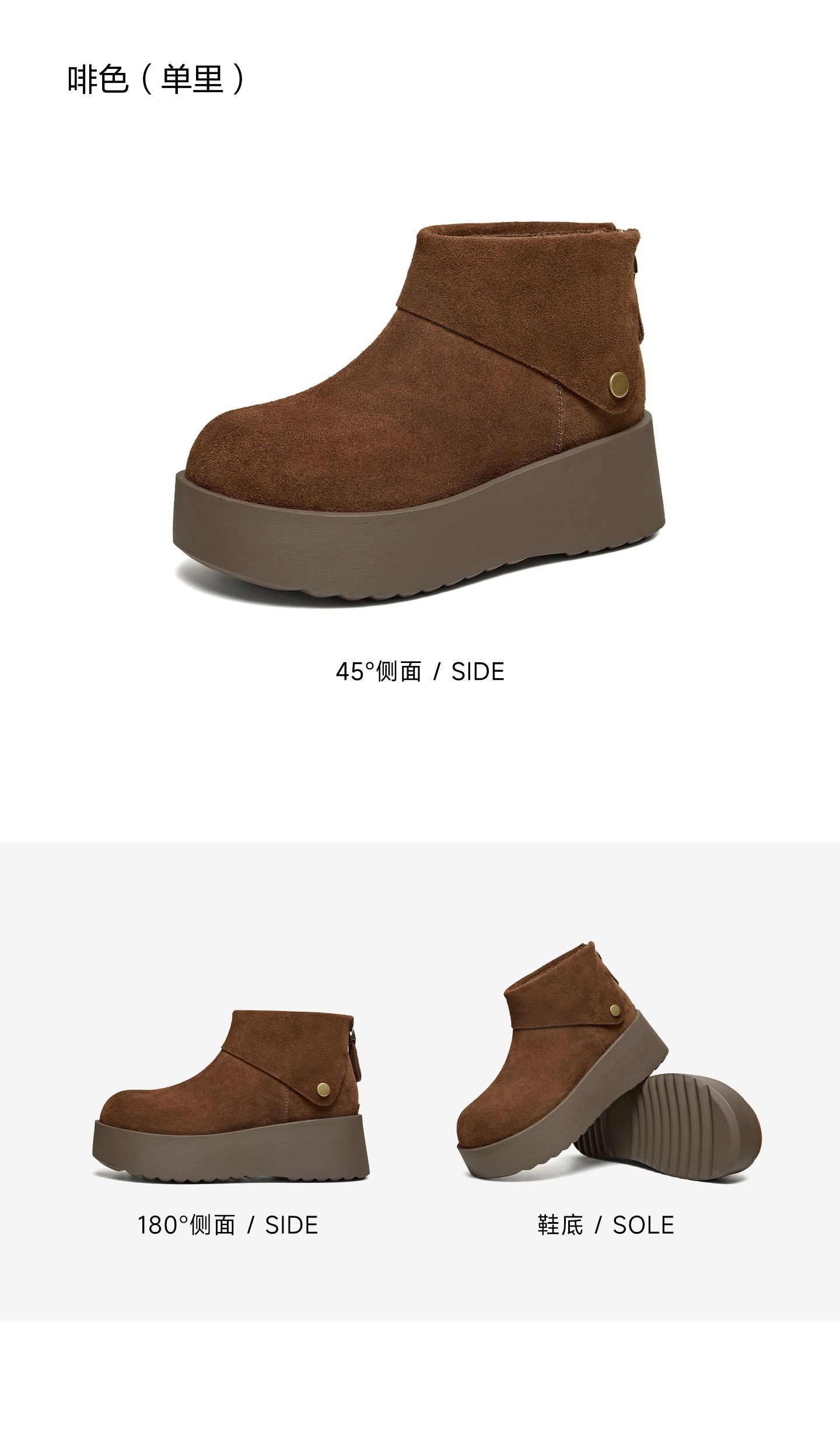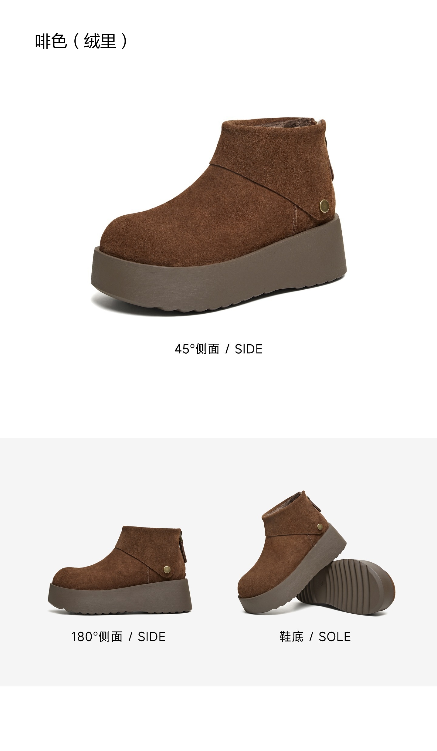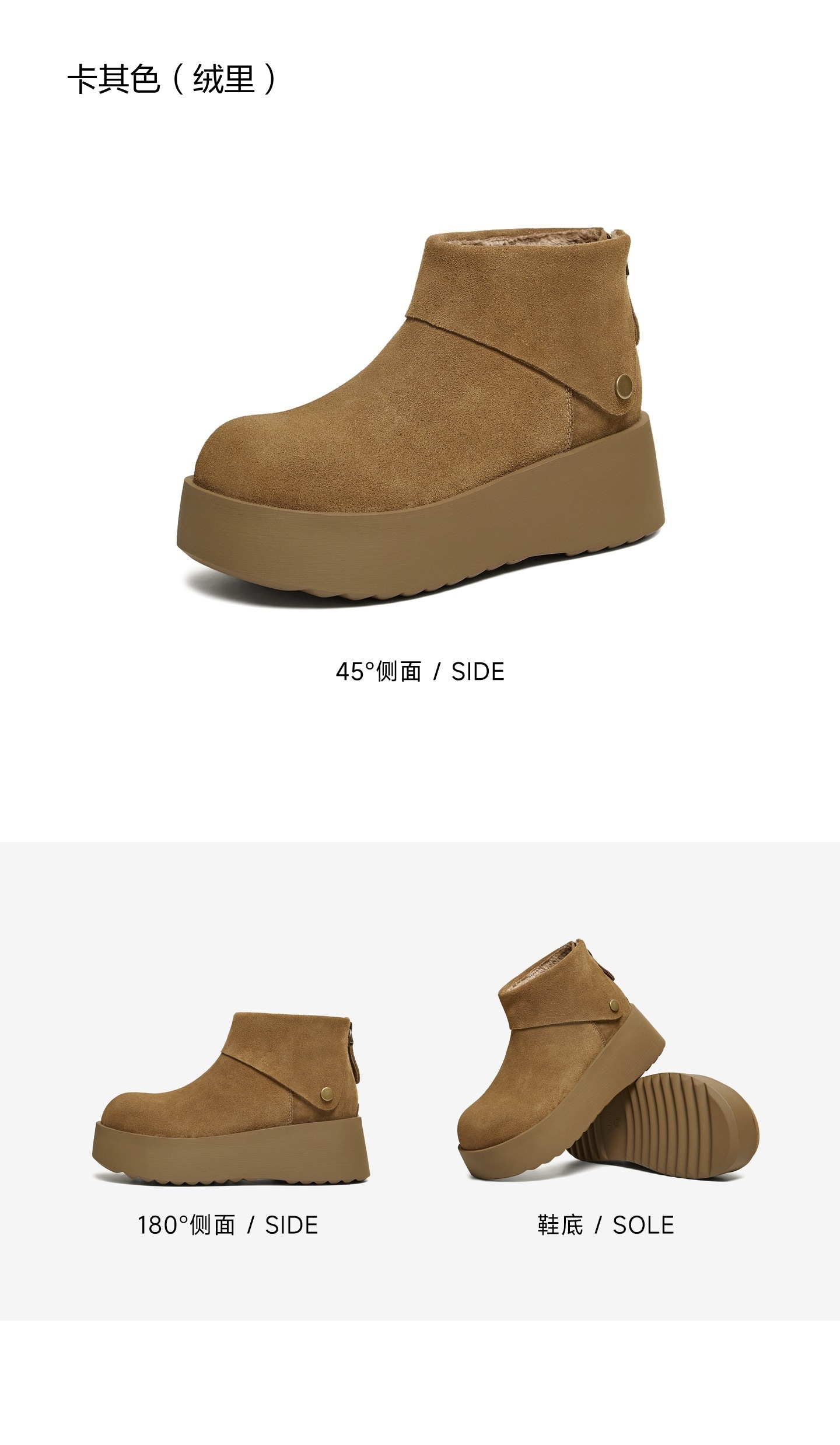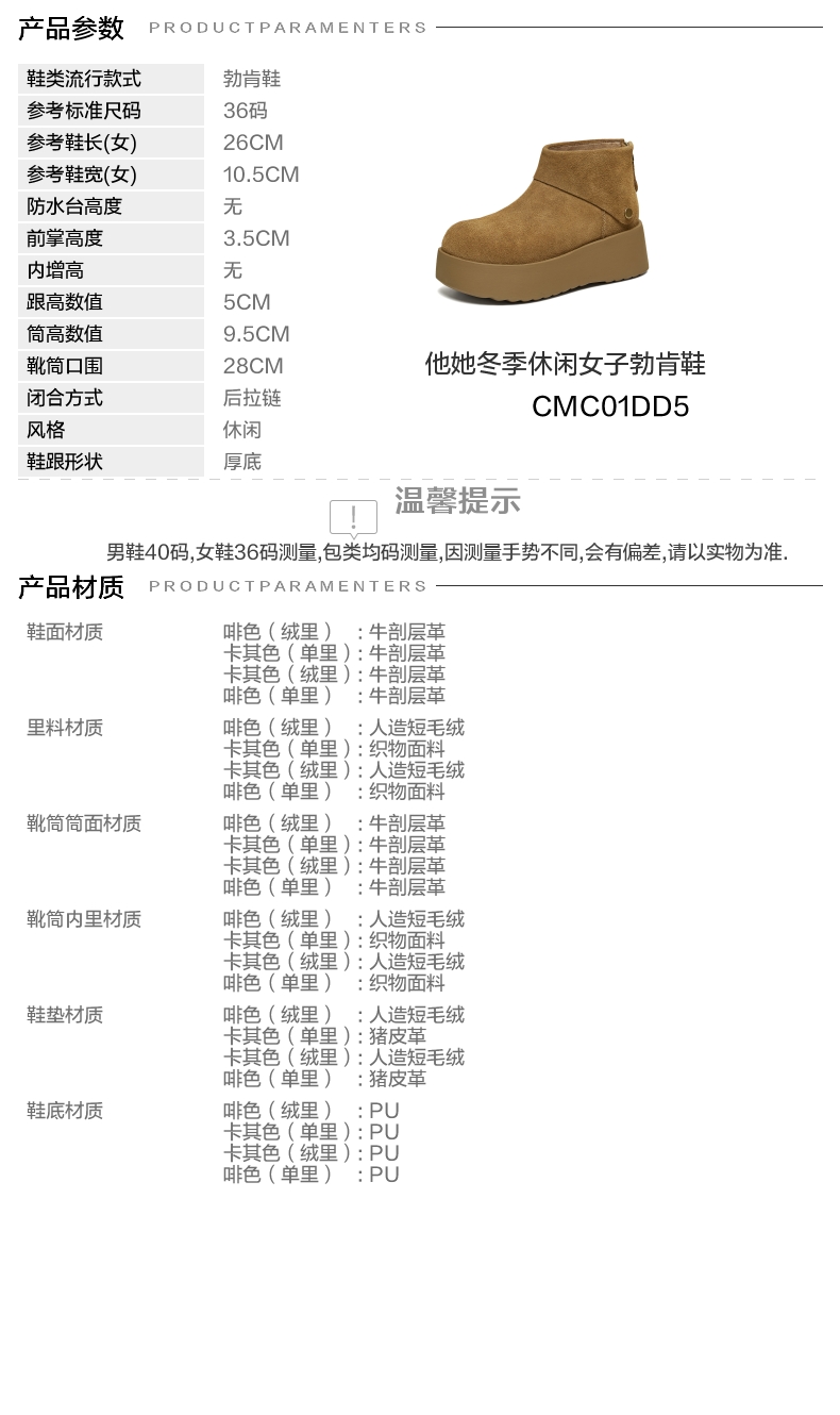 | 鞋底材质:PU | 靴筒内里材质:人造短毛绒 | 内增高:无 | 鞋面材质:牛剖层革 | 闭合方式:后拉链 |