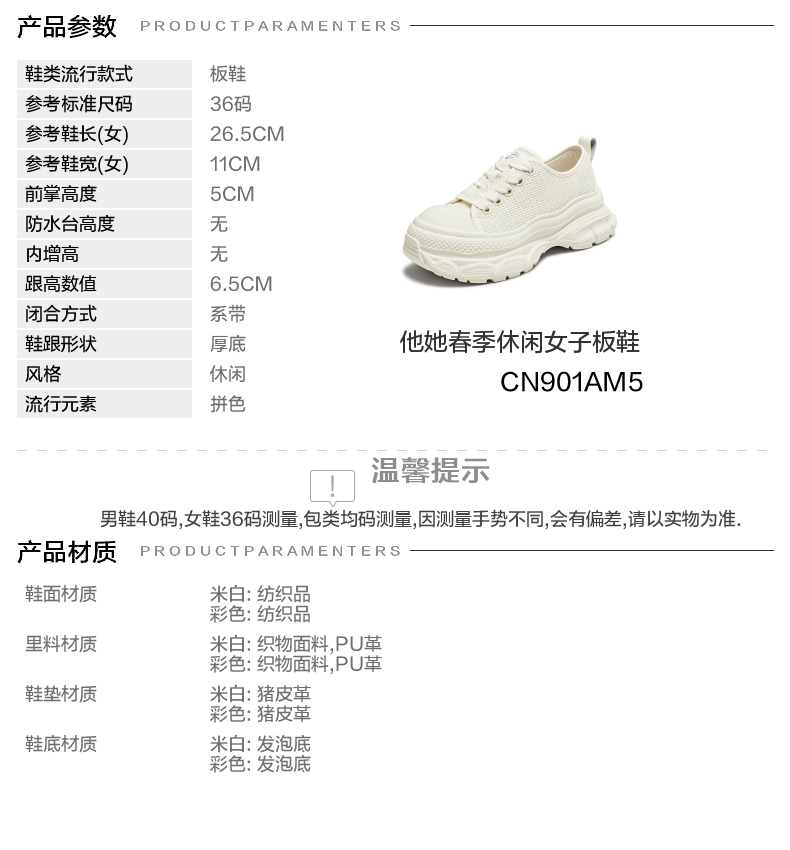 | 鞋跟形状:厚底 | 参考鞋长(女):26.5CM | 流行元素:拼色 | 参考鞋宽(女):11CM | 风格:休闲 |