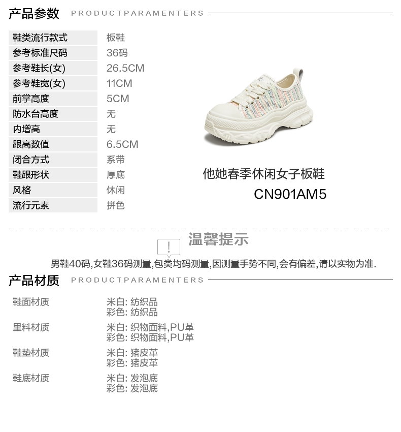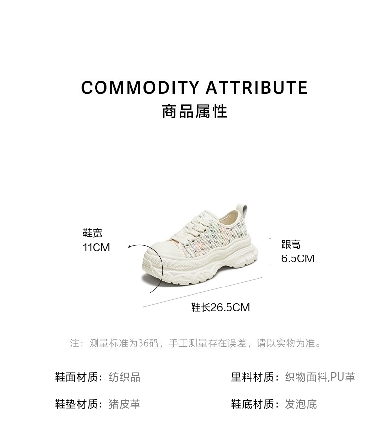 | 鞋跟形状:厚底 | 参考鞋长(女):26.5CM | 流行元素:拼色 | 参考鞋宽(女):11CM | 风格:休闲 |