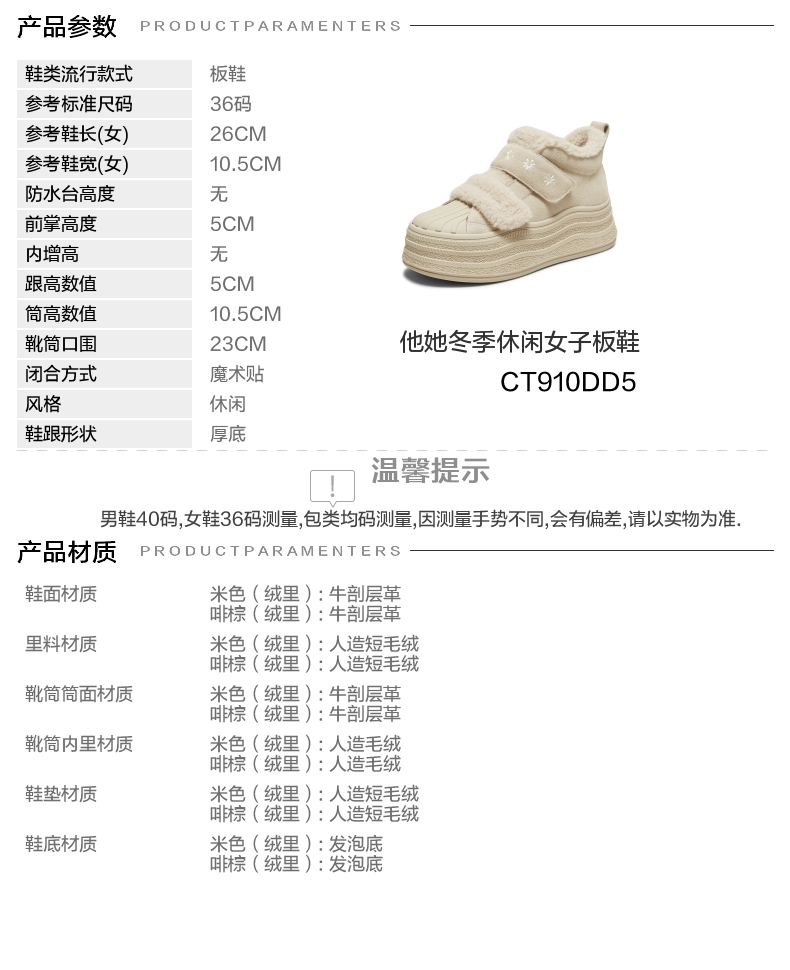 | 里料材质:人造短毛绒 | 制鞋工艺:胶贴皮鞋 | 鞋垫材质:人造短毛绒 | 款式季节:冬季 | 前掌高度:5CM |