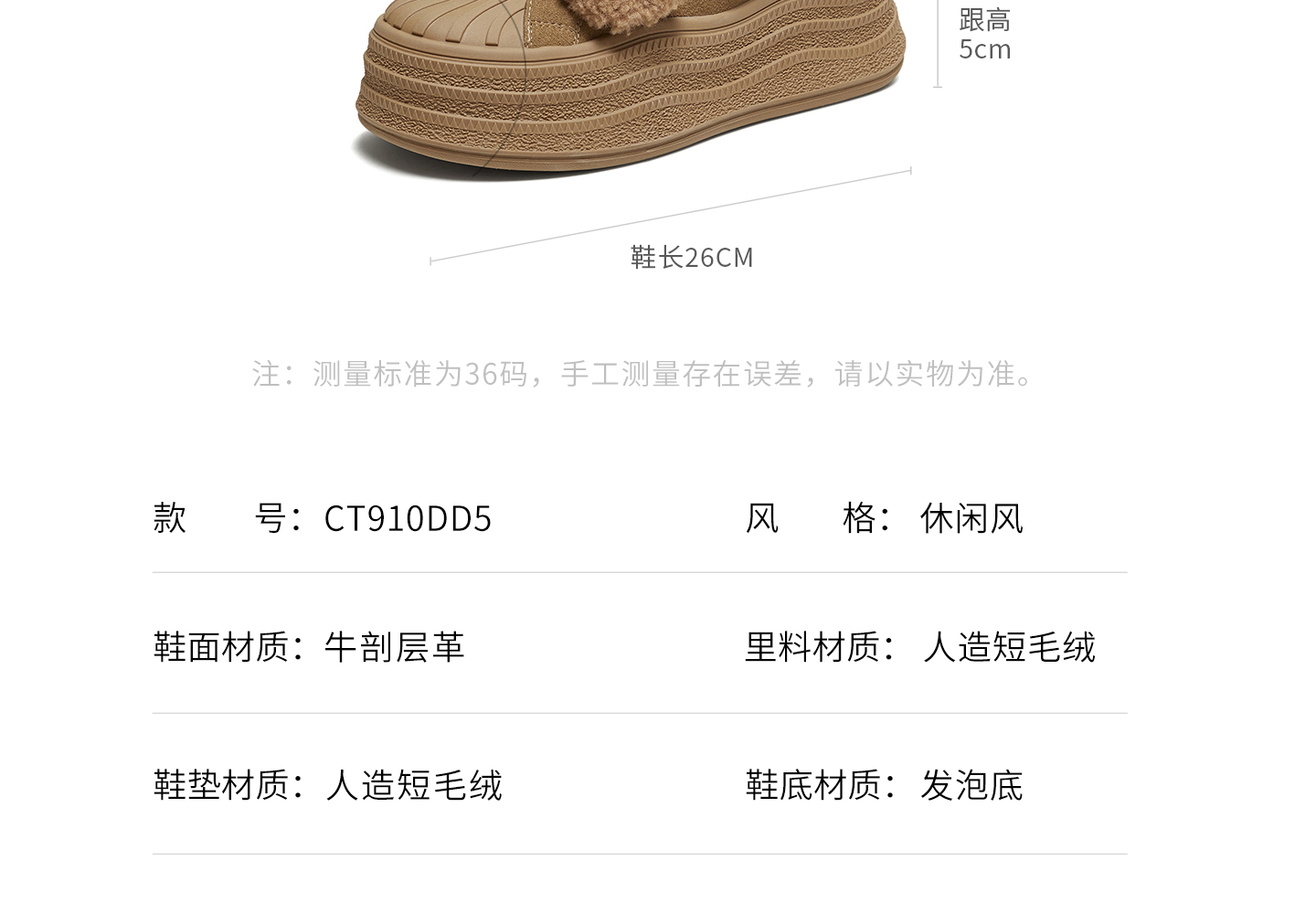 | 鞋帮:低帮 | 鞋底材质:发泡底 | 靴筒内里材质:人造毛绒 | 内增高:无 | 鞋面材质:牛剖层革 |