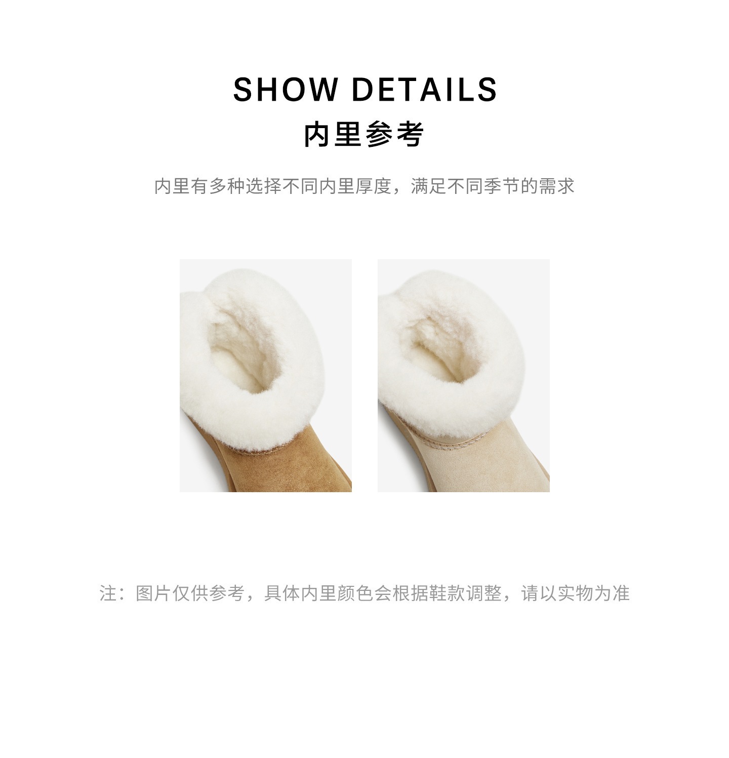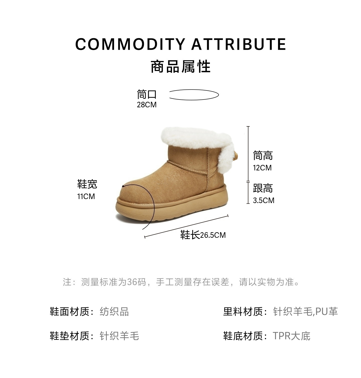 | 帮面材质:织物 | 配跟:无 | 靴筒口围:28CM | 上市时间:2025年冬季 | 鞋类流行款式:雪地靴 |
