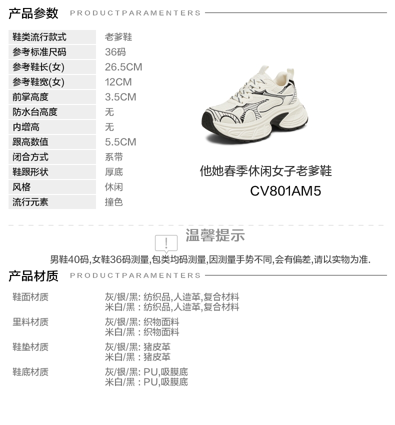 | 鞋跟形状:厚底 | 参考鞋长(女):26.5CM | 流行元素:撞色 | 参考鞋宽(女):12CM | 风格:休闲 |