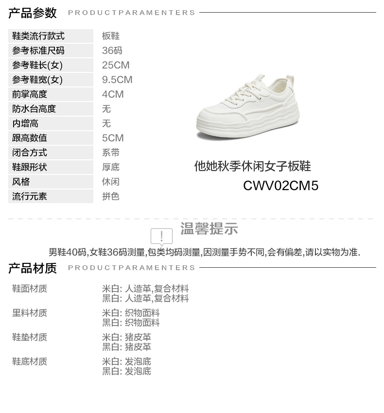 | 鞋跟形状:厚底 | 参考鞋长(女):25CM | 流行元素:拼色 | 参考鞋宽(女):9.5CM | 风格:休闲 |