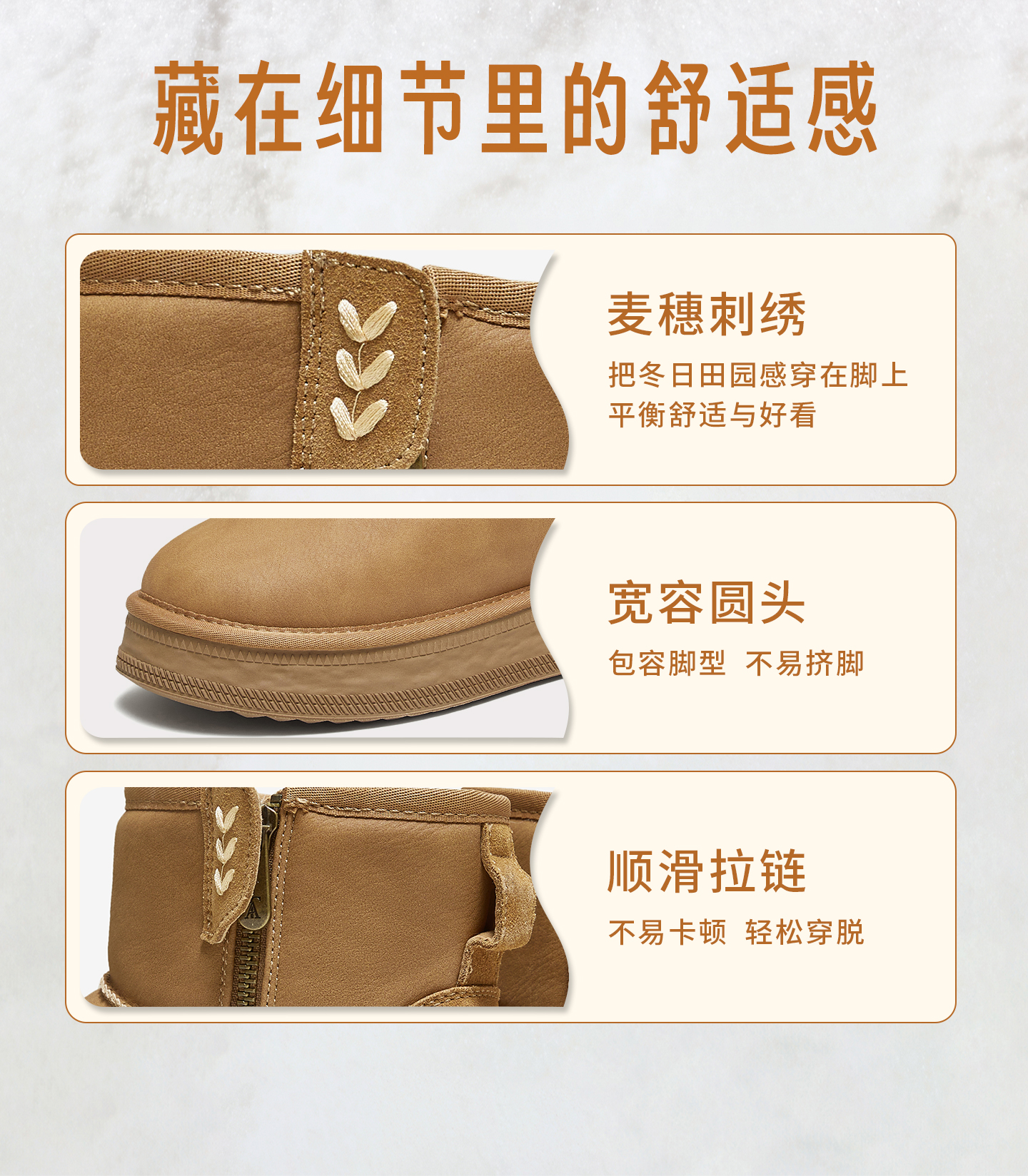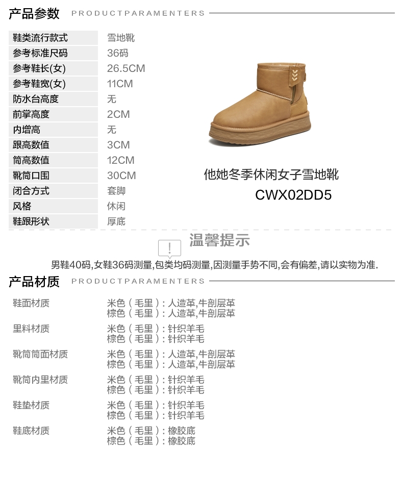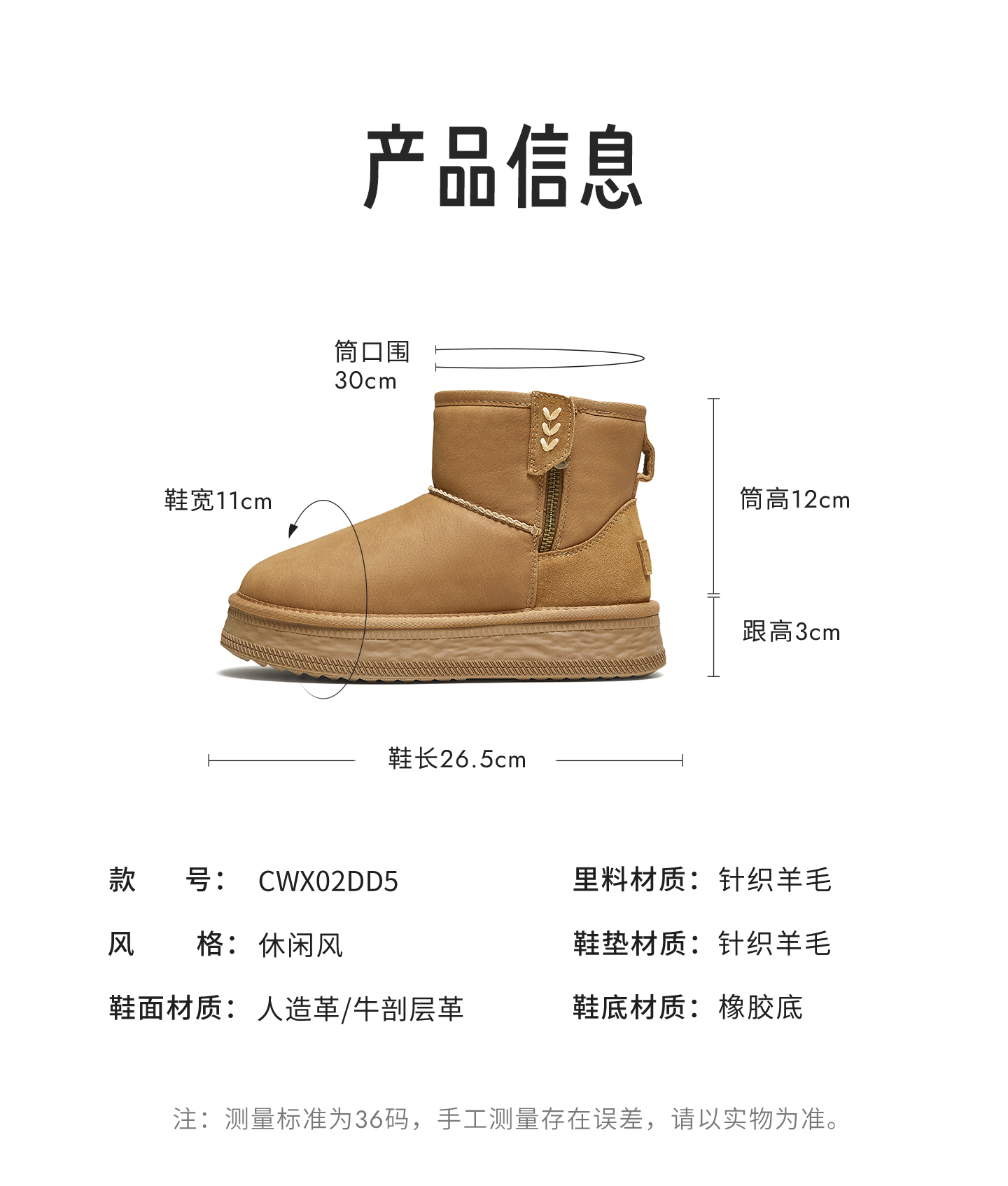 | 帮面材质:牛剖层革人造革 | 配跟:无 | 靴筒口围:30CM | 上市时间:2025年冬季 | 鞋类流行款式:雪地靴 |