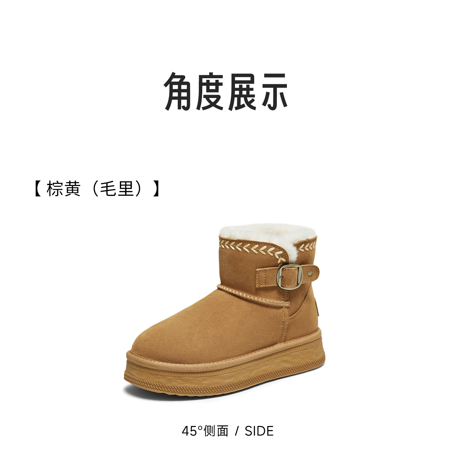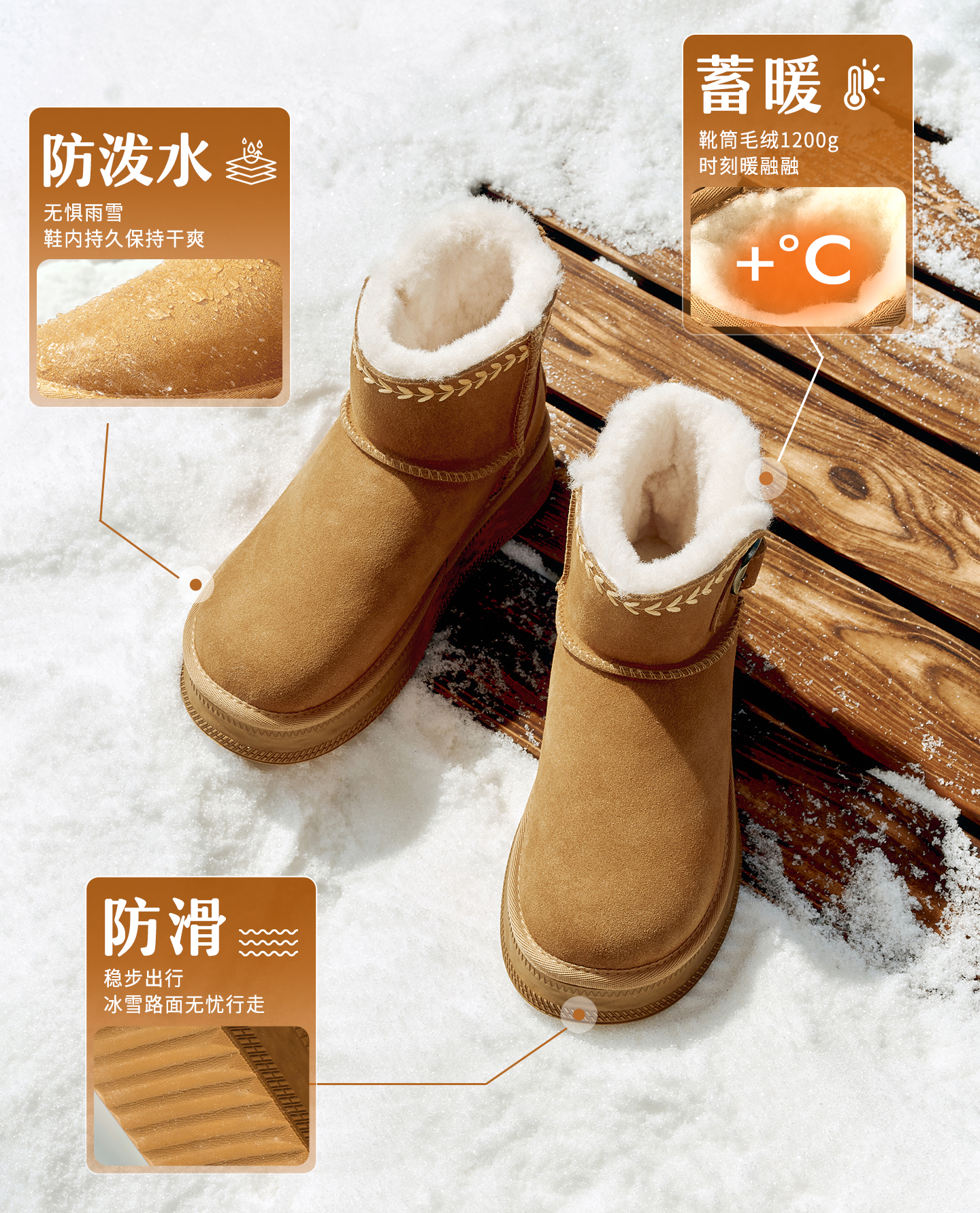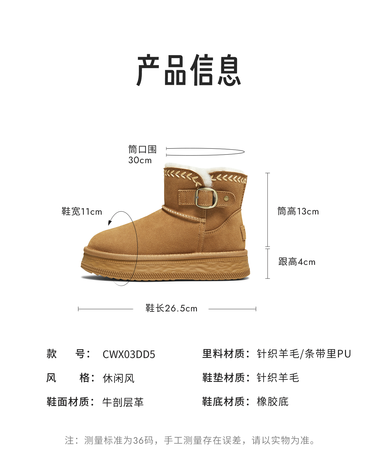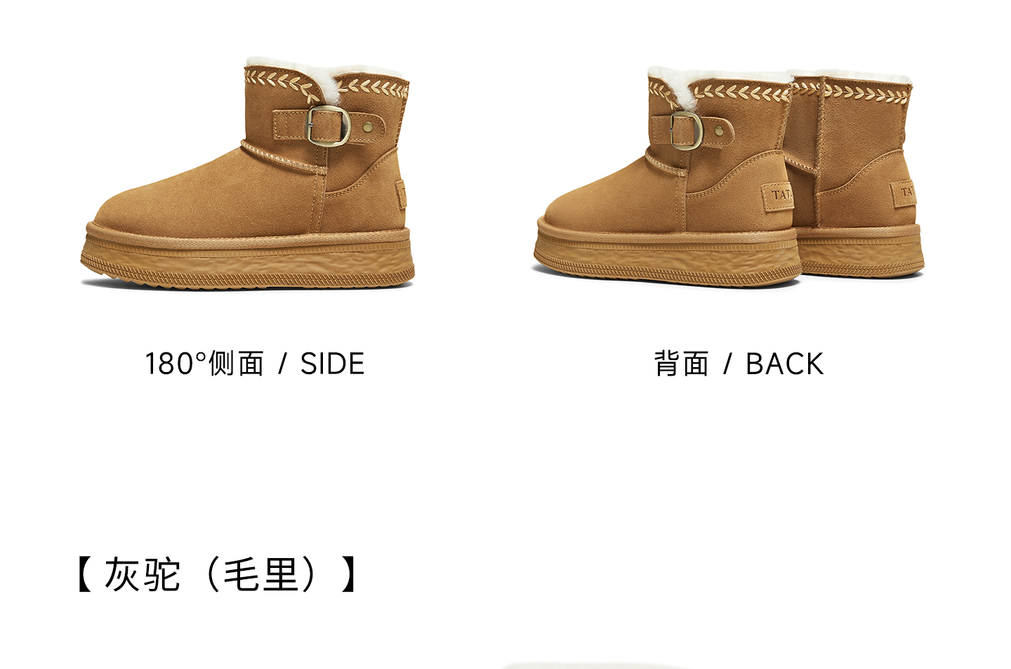 | 帮面材质:牛剖层革 | 配跟:有 | 靴筒口围:30CM | 上市时间:2025年冬季 | 鞋类流行款式:雪地靴 |