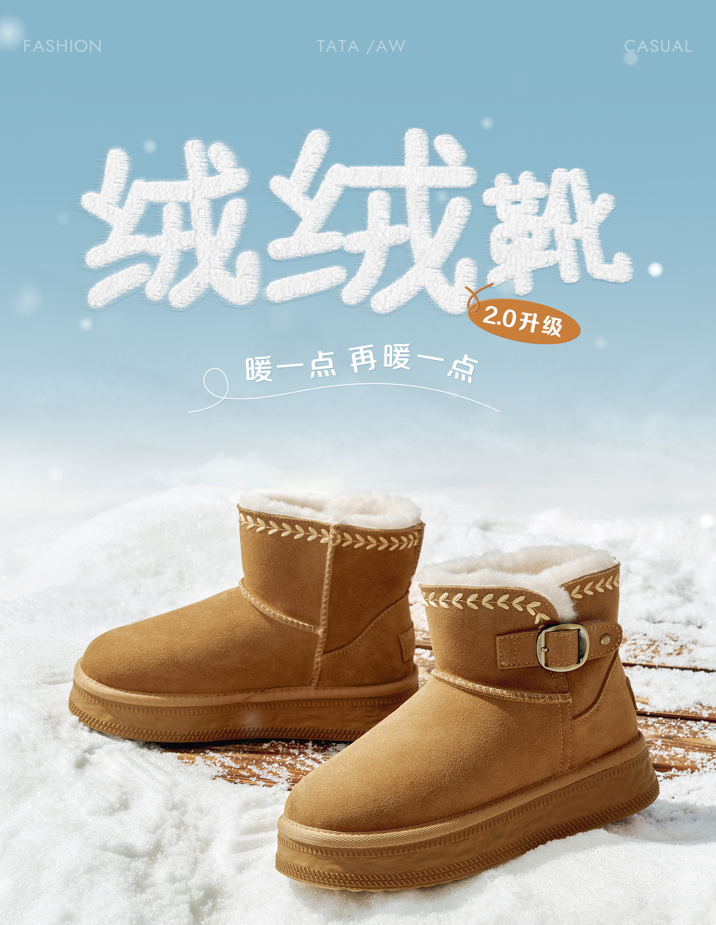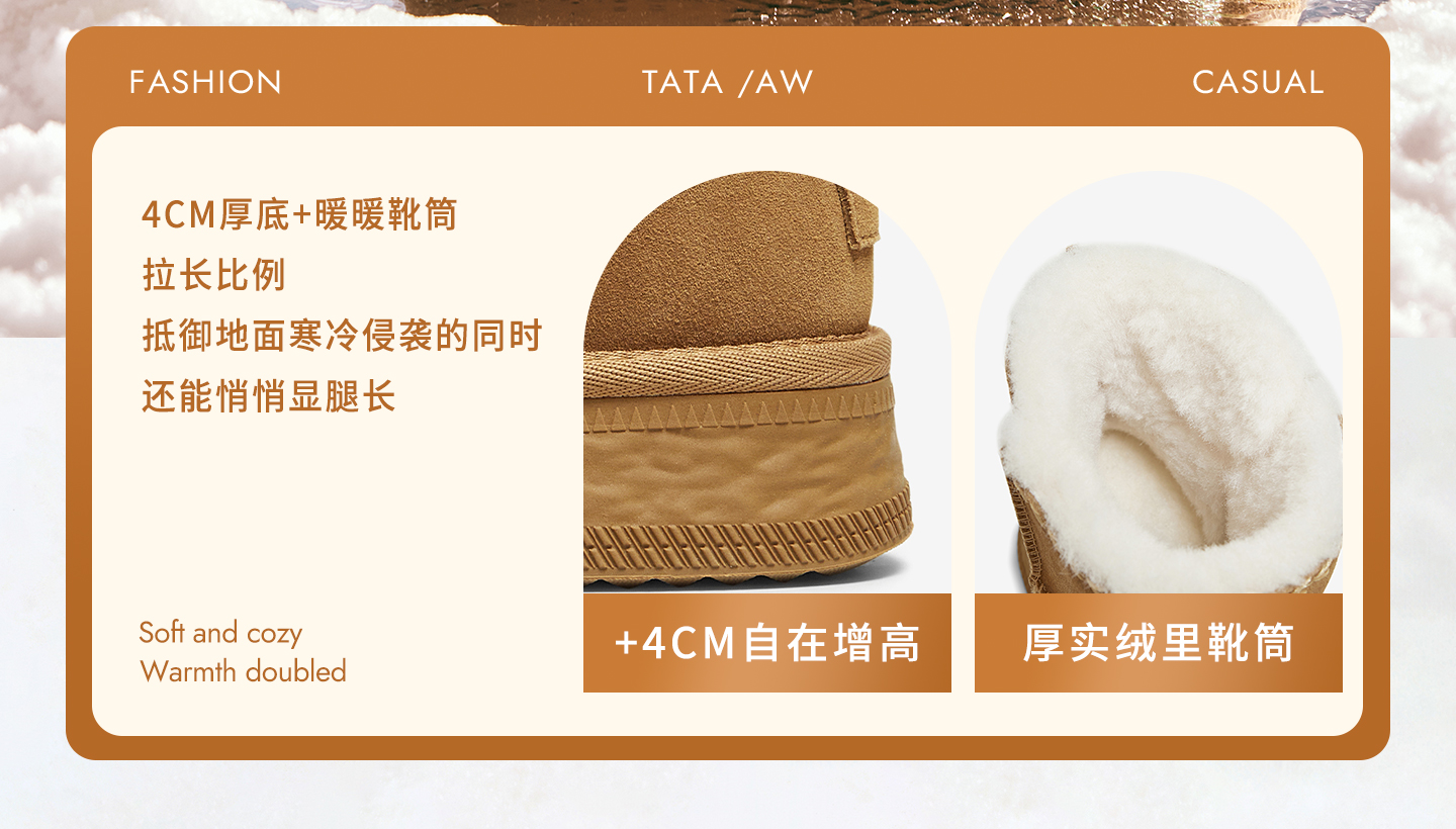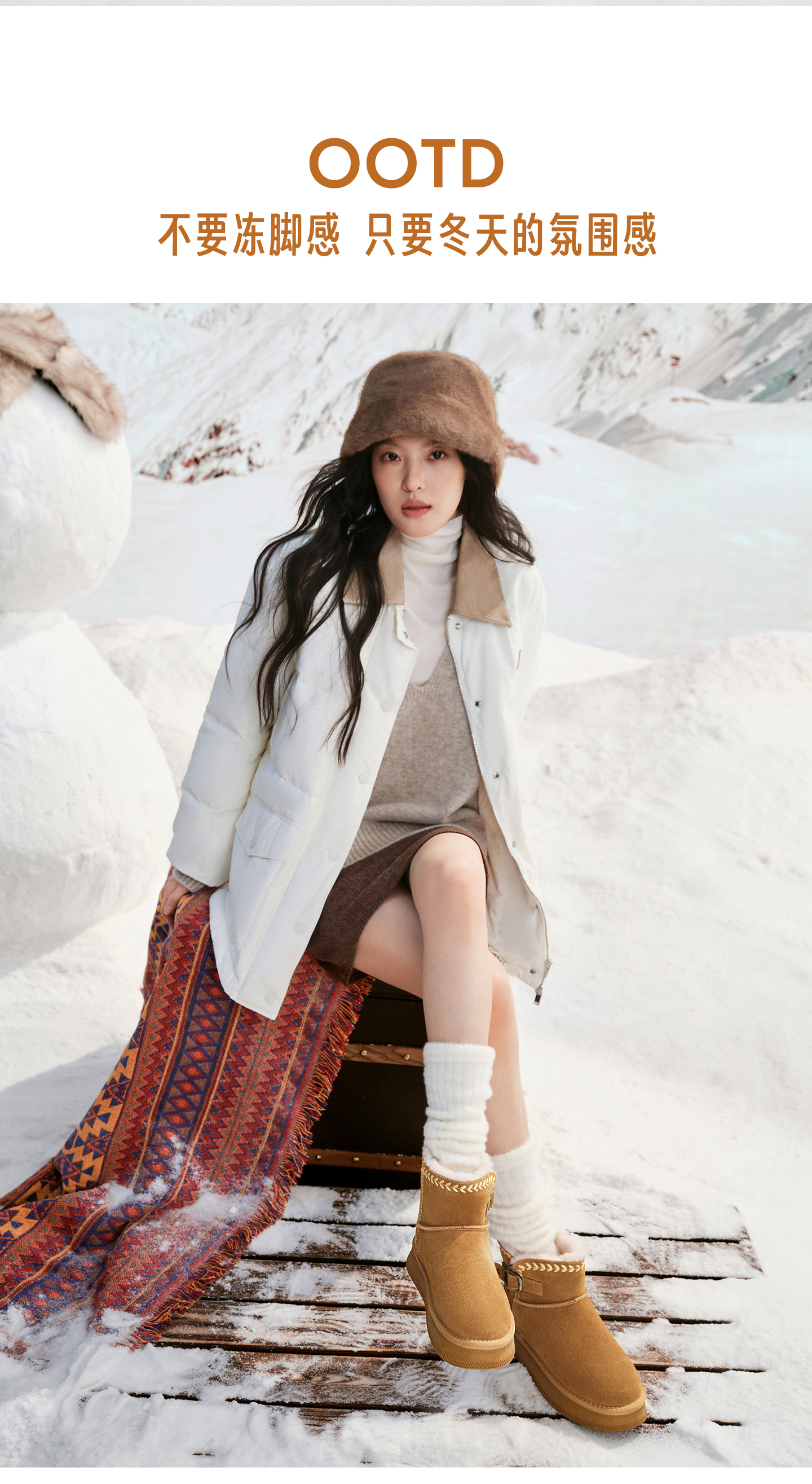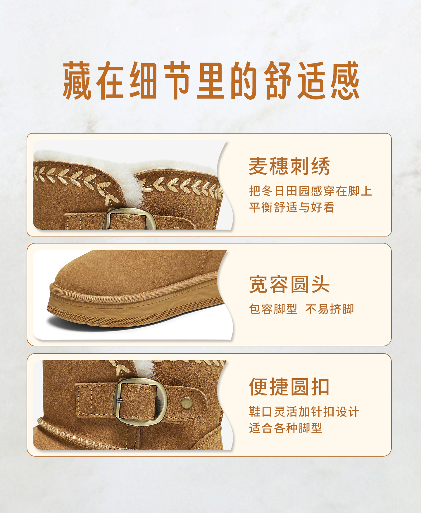 | 帮面材质:牛剖层革 | 配跟:有 | 靴筒口围:30CM | 上市时间:2025年冬季 | 鞋类流行款式:雪地靴 |