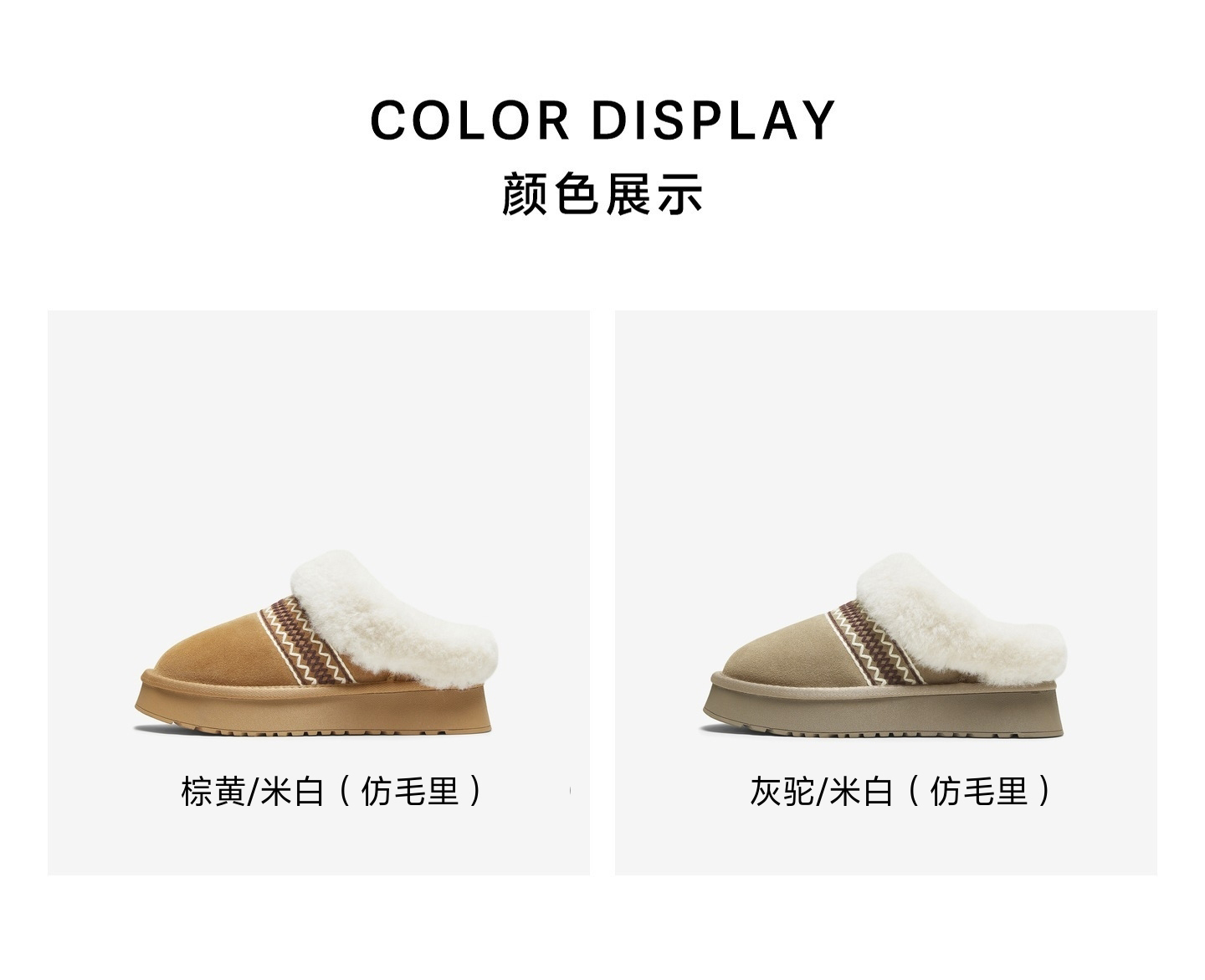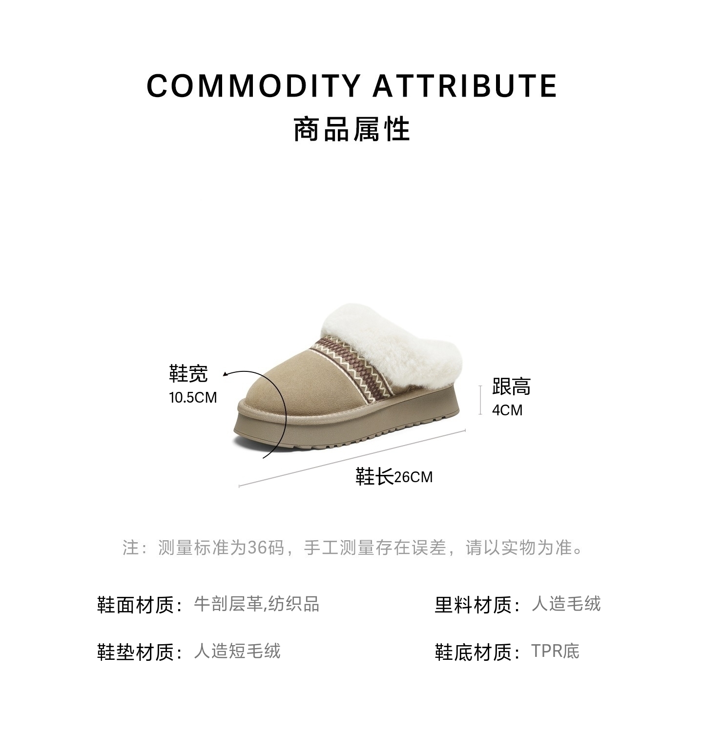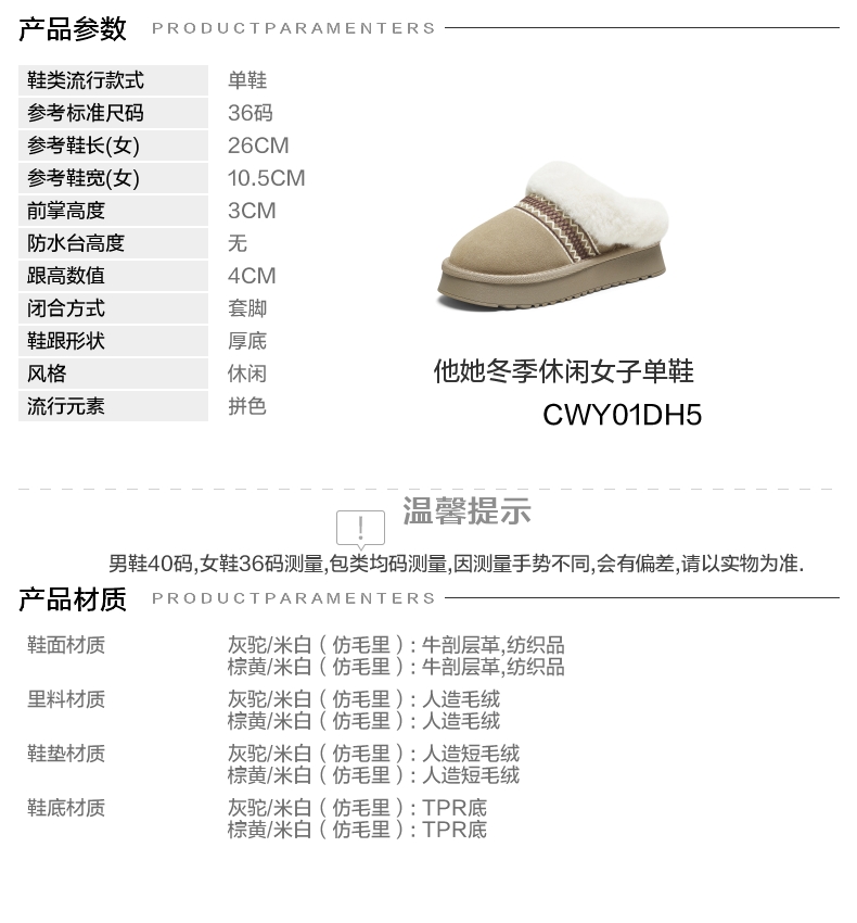 | 跟高数值:4CM | 色系:灰色 | 配跟:无 | 性别:女子 | 里料材质:人造毛绒 |
