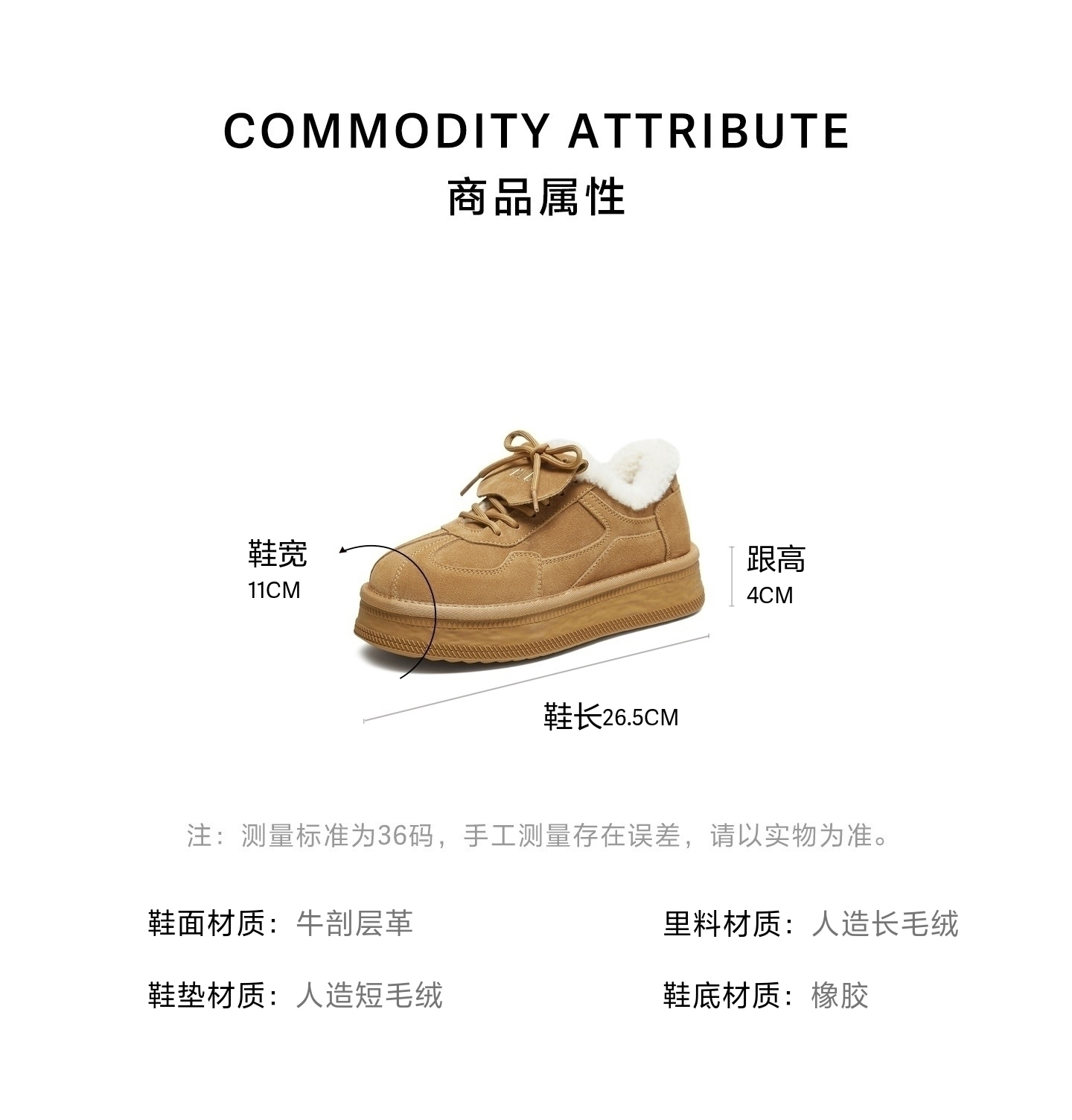 | 色系:棕色 | 跟高数值:4CM | 适用人群:女子 | 性别:女子 | 里料材质:人造长毛绒 |