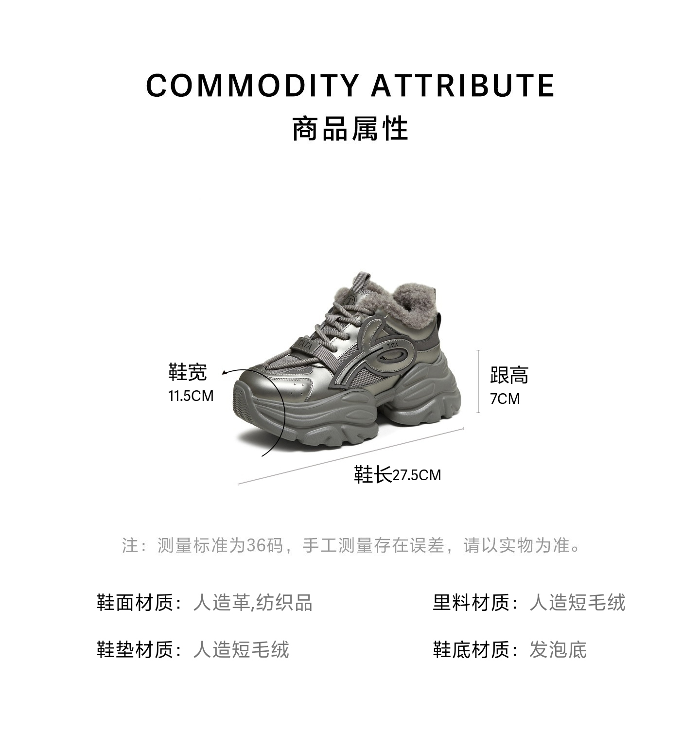 | 色系:银色 | 跟高数值:7CM | 适用人群:女子 | 性别:女子 | 里料材质:人造短毛绒 |