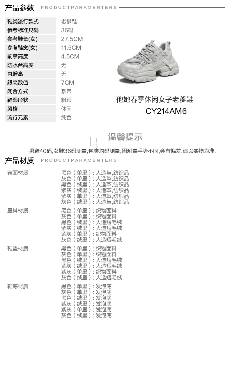 | 皮质特征:软面皮 | 前掌高度:4.5CM | 防水台高度:无 | 鞋类流行款式:老爹鞋 |