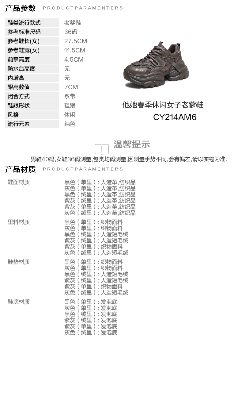 | 皮质特征:软面皮 | 前掌高度:4.5CM | 防水台高度:无 | 鞋类流行款式:老爹鞋 |