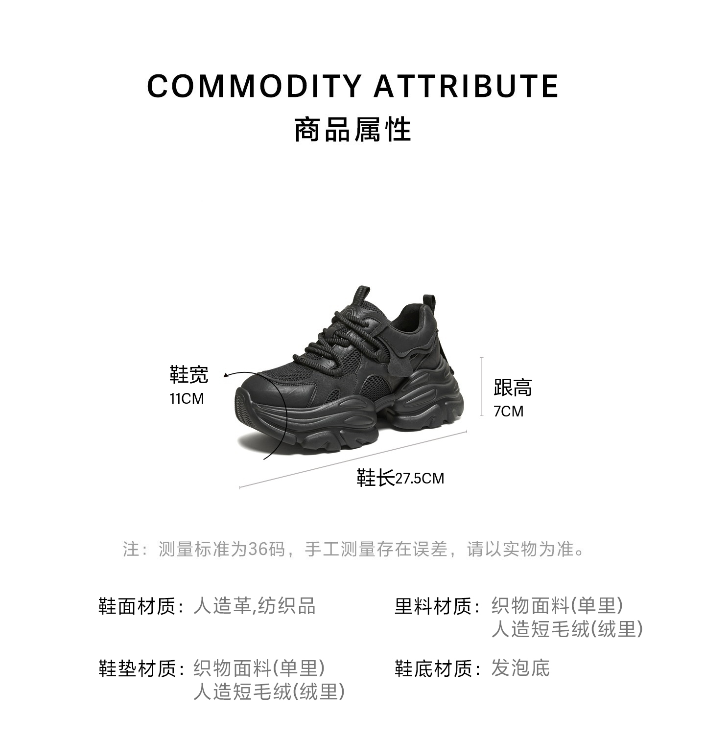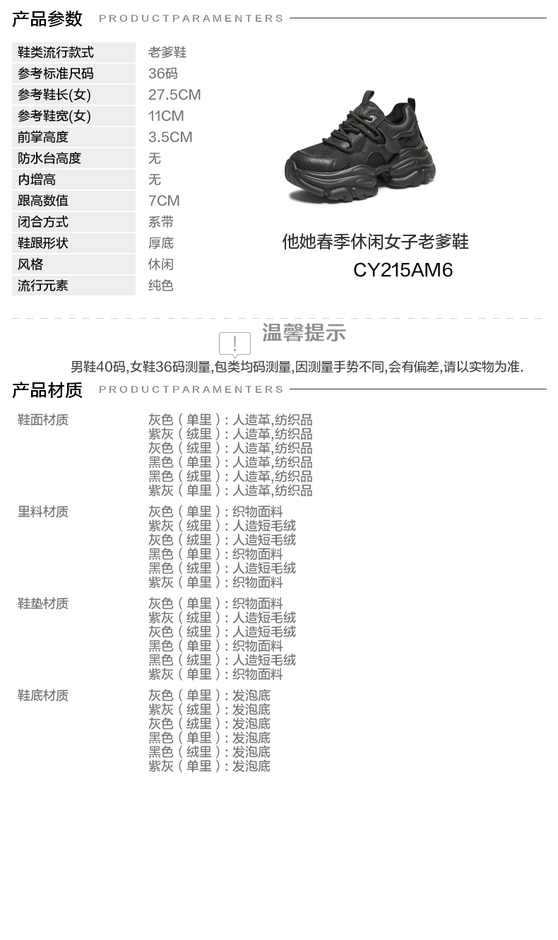 | 鞋跟形状:厚底 | 参考鞋长(女):27.5CM | 流行元素:纯色 | 参考鞋宽(女):11CM | 风格:休闲 |