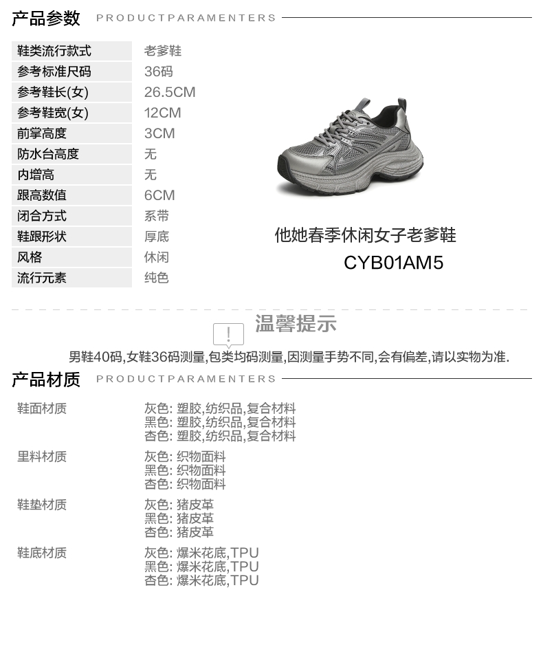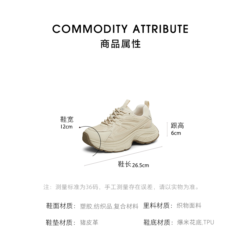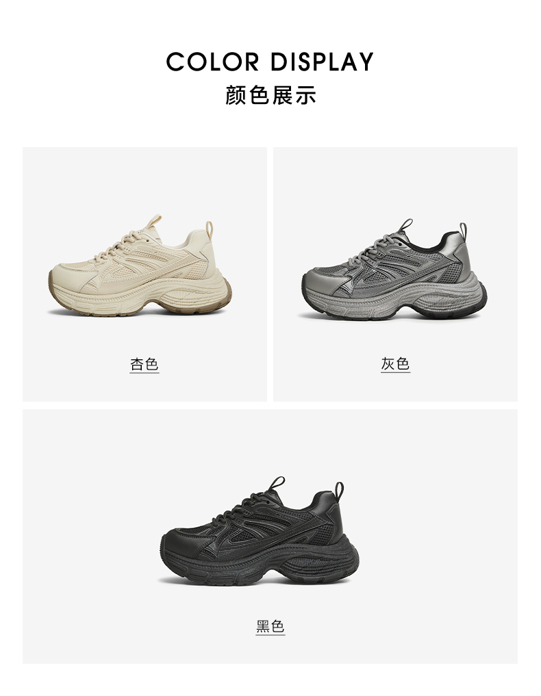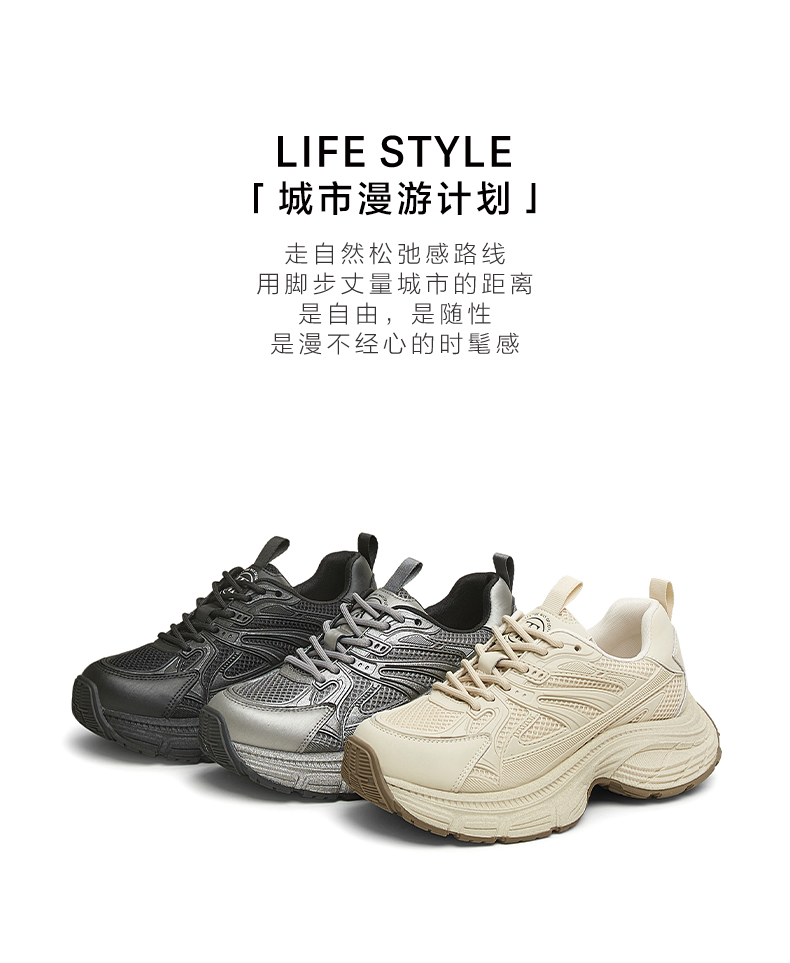 | 上市时间:2025年春季 | 生产/经销/进口厂家:丽荣鞋业(深圳)有限公司 | 鞋类流行款式:老爹鞋 | 鞋头款式:圆头 | 执行标准:舒适运动鞋Q/LR002-2023 |