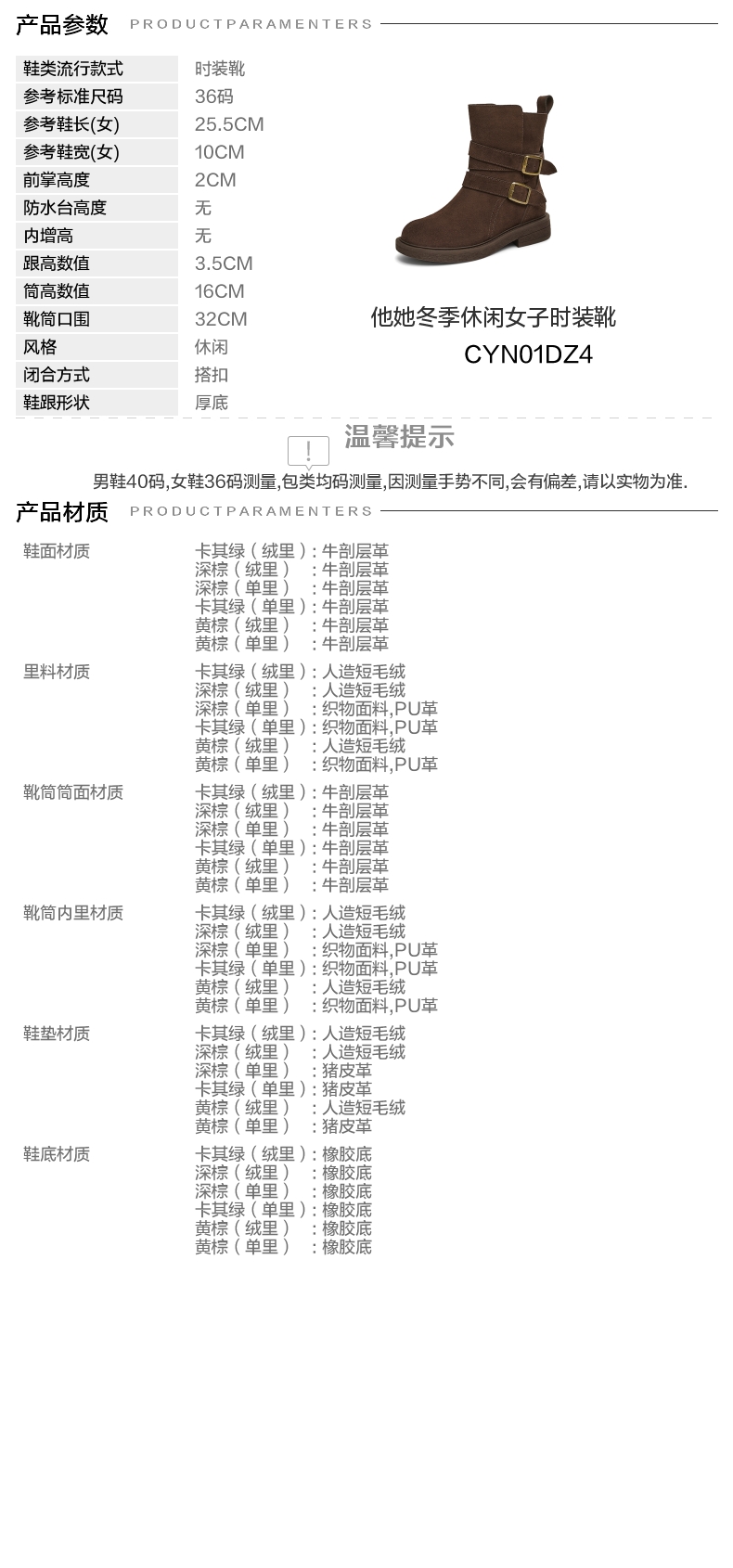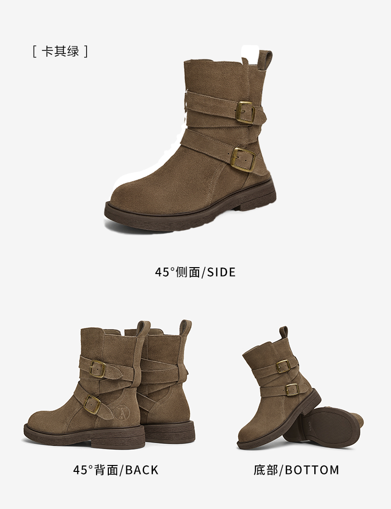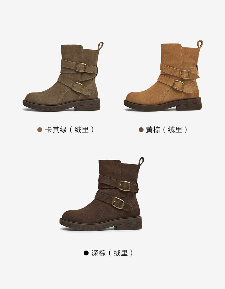 | 鞋底材质:橡胶底 | 靴筒内里材质:织物面料PU革 | 内增高:无 | 鞋面材质:牛剖层革 | 闭合方式:搭扣 |