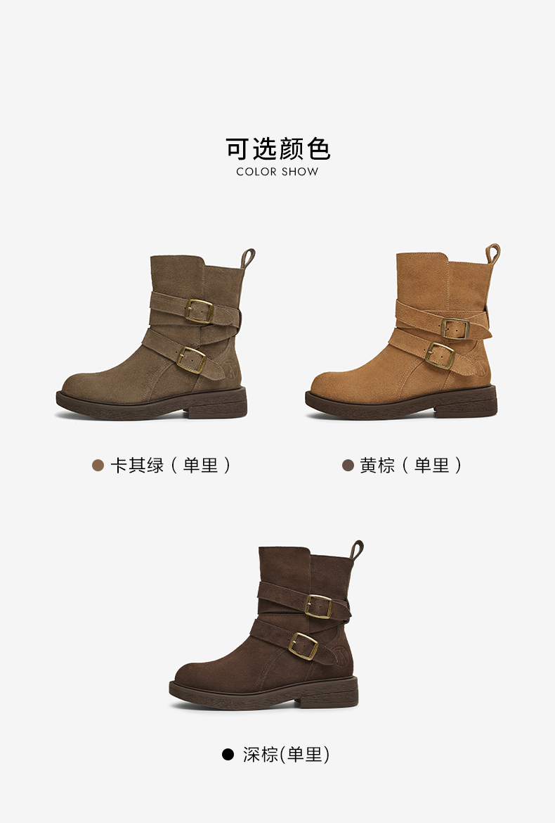 | 鞋底材质:橡胶底 | 靴筒内里材质:人造短毛绒 | 内增高:无 | 鞋面材质:牛剖层革 | 闭合方式:搭扣 |