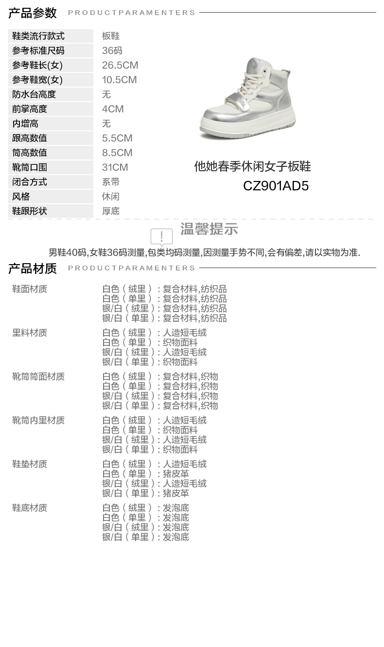 | 帮面材质:织物复合材料 | 配跟:有 | 靴筒口围:31CM | 上市时间:2025年春季 | 鞋类流行款式:板鞋 |