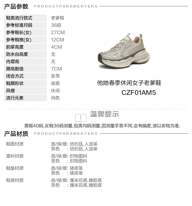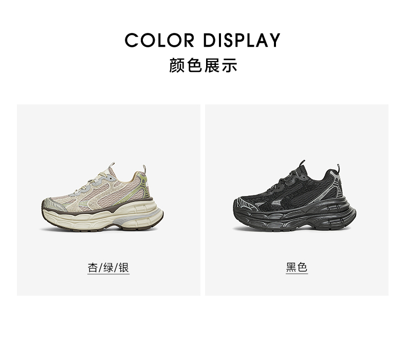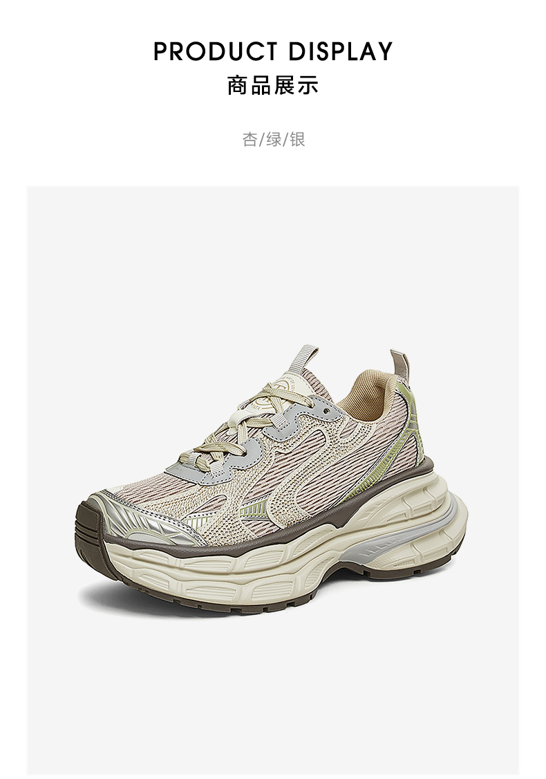 | 上市时间:2025年春季 | 生产/经销/进口厂家:丽荣鞋业(深圳)有限公司 | 鞋类流行款式:老爹鞋 | 鞋头款式:圆头 | 执行标准:舒适运动鞋Q/LR002-2023 |