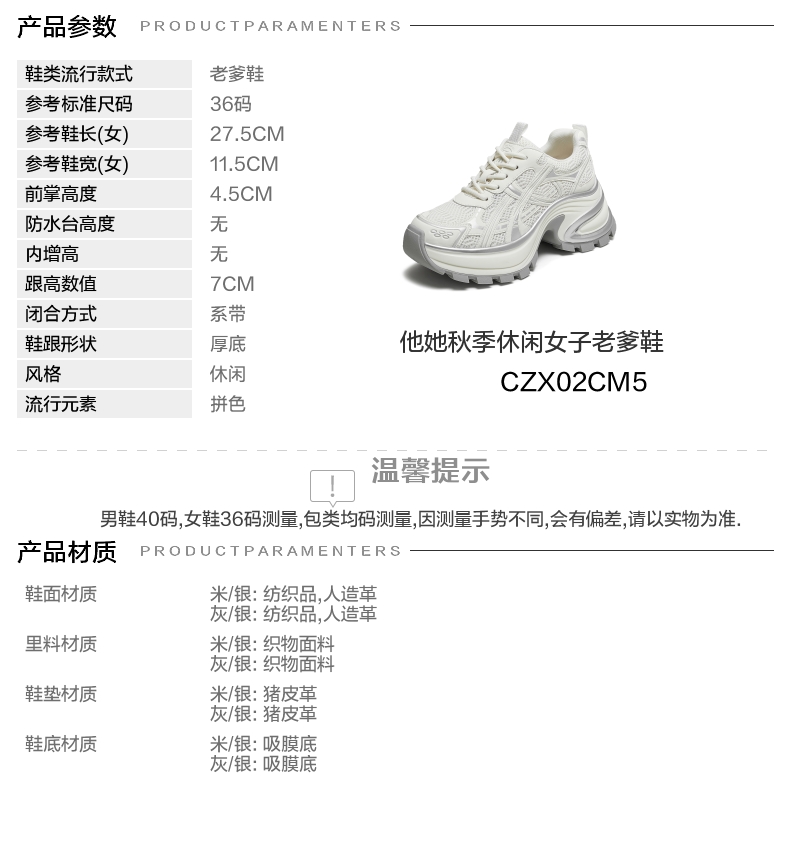 | 鞋跟形状:厚底 | 参考鞋长(女):27.5CM | 流行元素:拼色 | 参考鞋宽(女):11.5CM | 风格:休闲 |