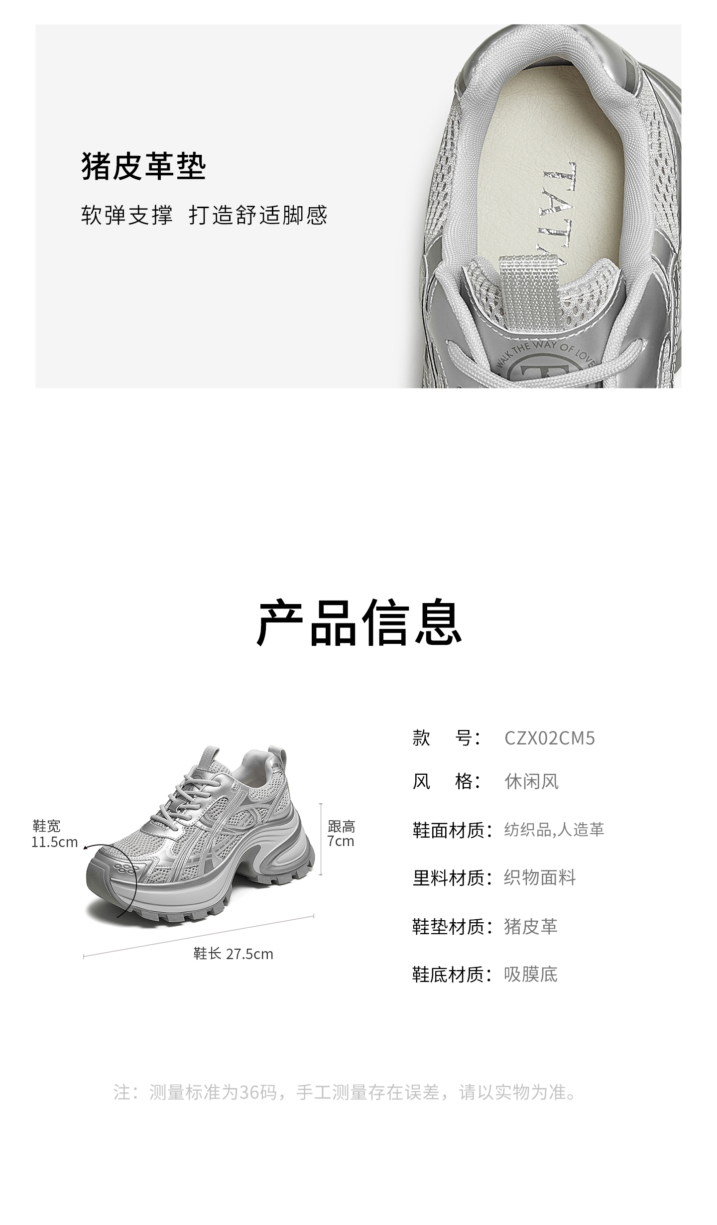 | 鞋跟形状:厚底 | 参考鞋长(女):27.5CM | 流行元素:拼色 | 参考鞋宽(女):11.5CM | 风格:休闲 |