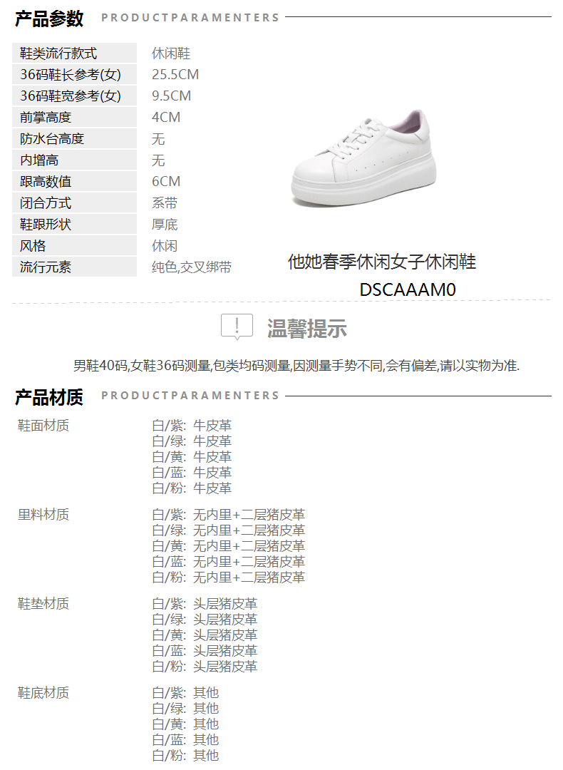 | 皮质特征:软面皮 | 前掌高度:4CM | 防水台高度:无 | 鞋类流行款式:休闲鞋 |