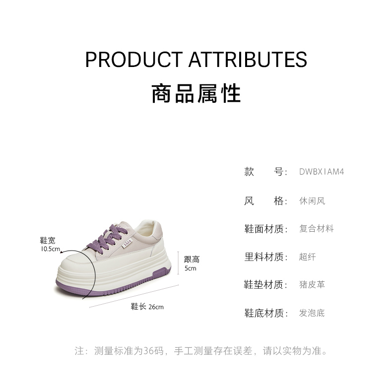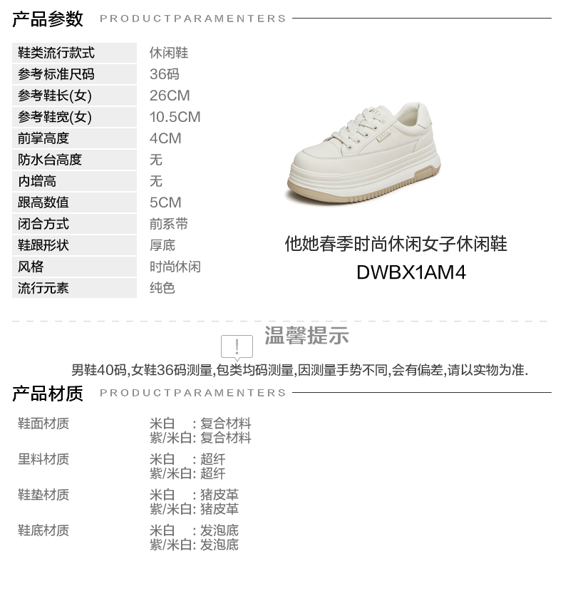 | 参考鞋长(女):26CM | 参考鞋宽(女):10.5CM | 风格:时尚休闲 | 色系:白色 | 参考标准尺码:36码 |