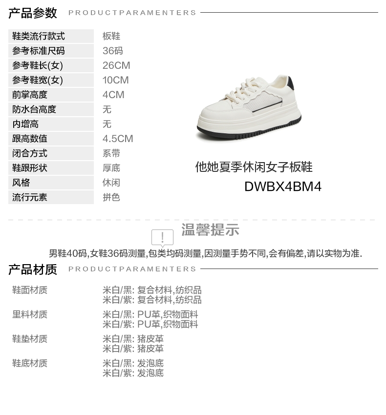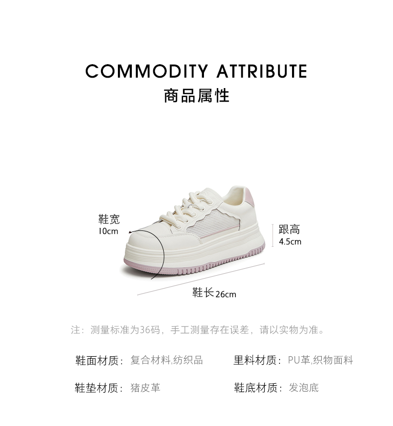 | 鞋跟形状:厚底 | 参考鞋长(女):26CM | 流行元素:拼色 | 参考鞋宽(女):10CM | 风格:休闲 |