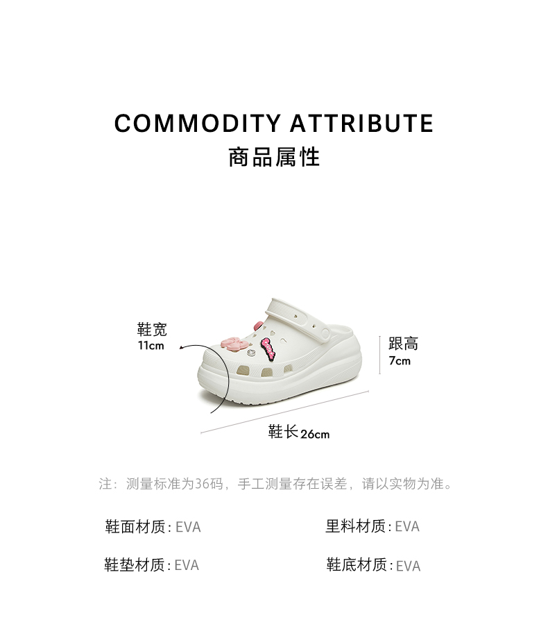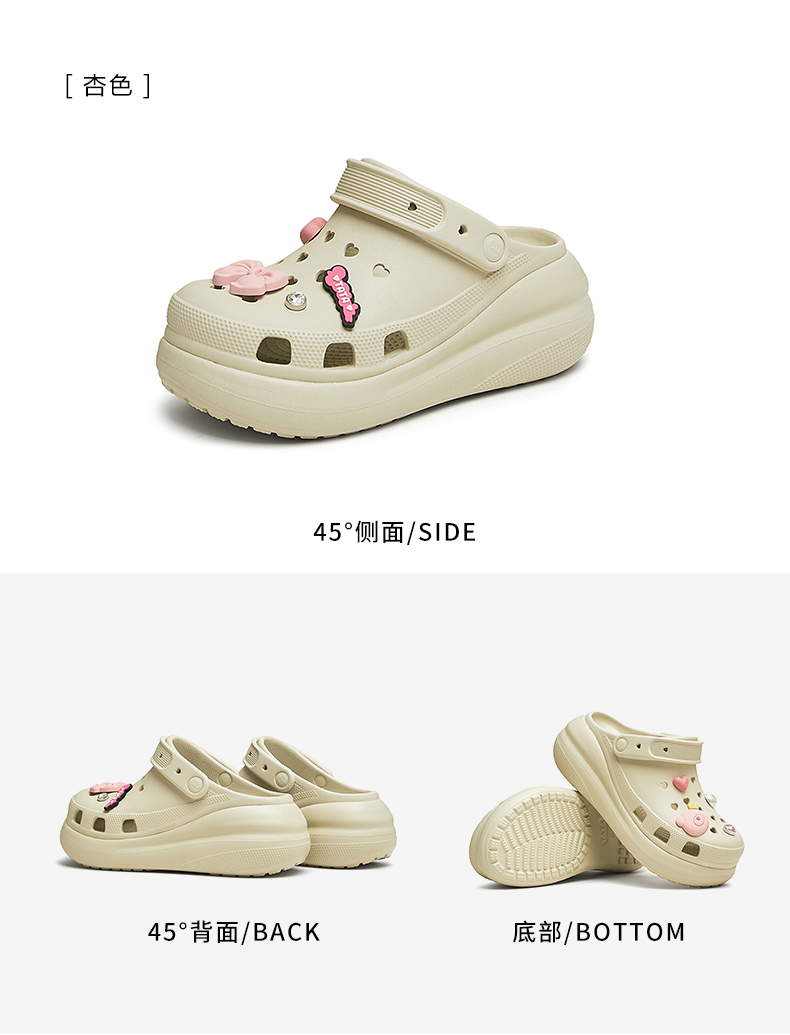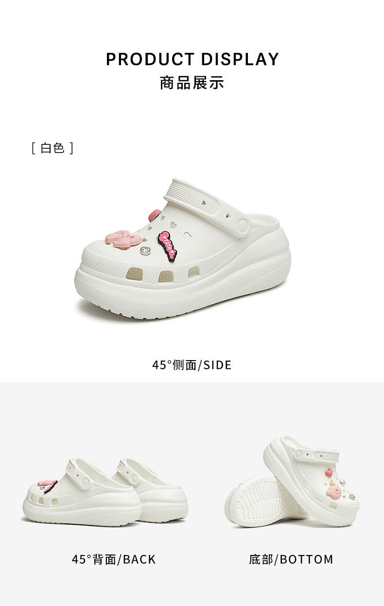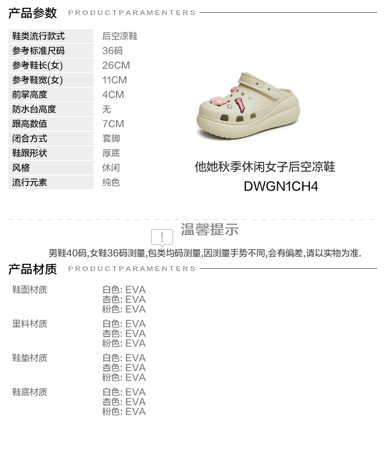 | 鞋头款式:圆头 | 鞋底材质:EVA | 鞋面图案:纯色 | 鞋跟形状:厚底 | 鞋面材质:EVA |