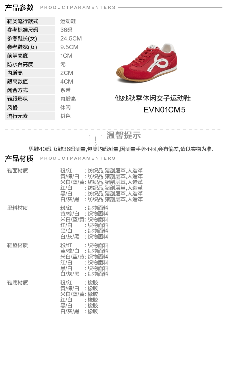 鞋跟形状:内增高 参考鞋长(女):24.5CM 流行元素:拼色 参考鞋宽(女):9.5CM 风格:休闲
