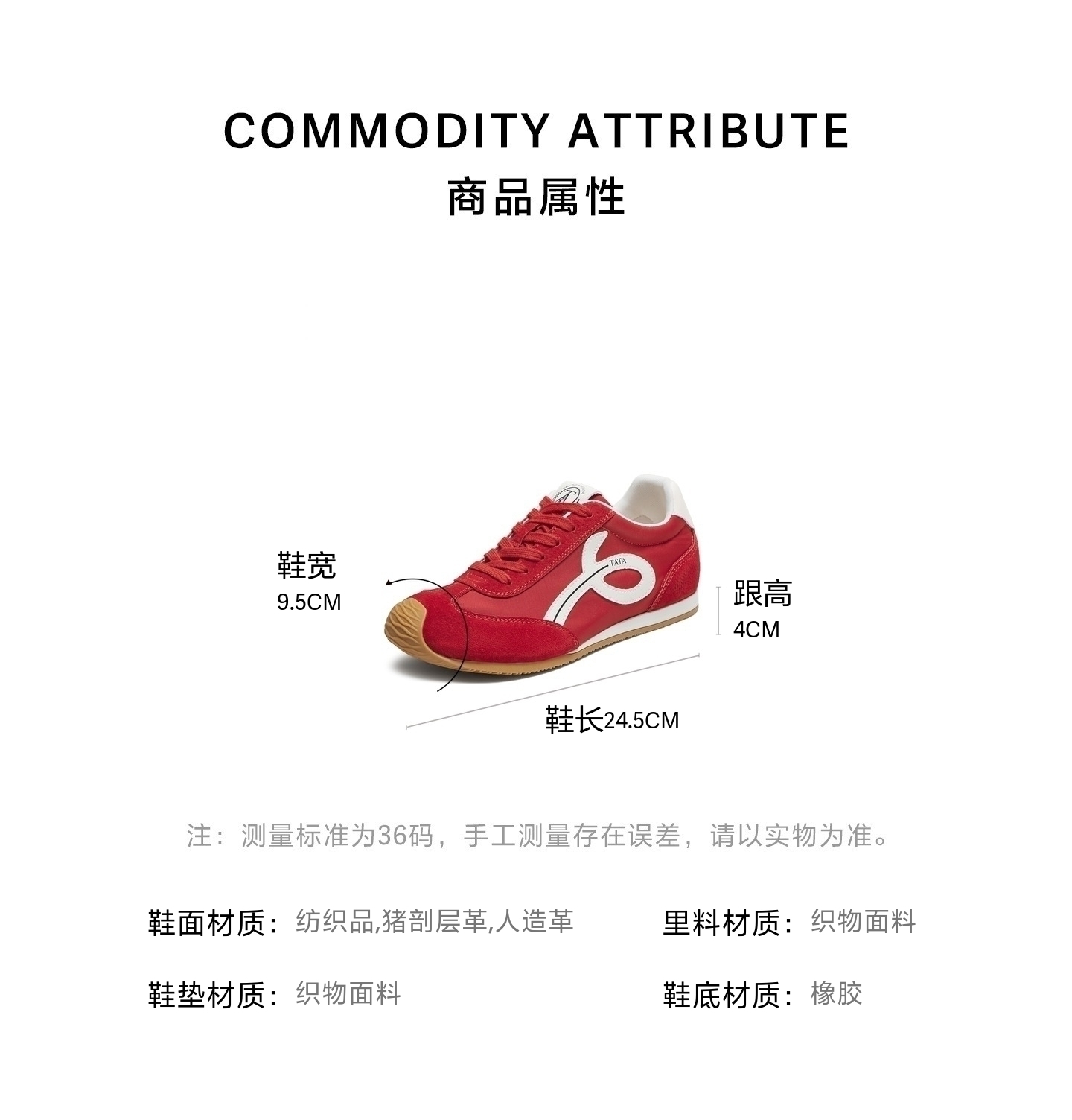 鞋帮:低帮 鞋底材质:橡胶 内增高:2CM 鞋面材质:人造革猪剖层革纺织品 闭合方式:系带