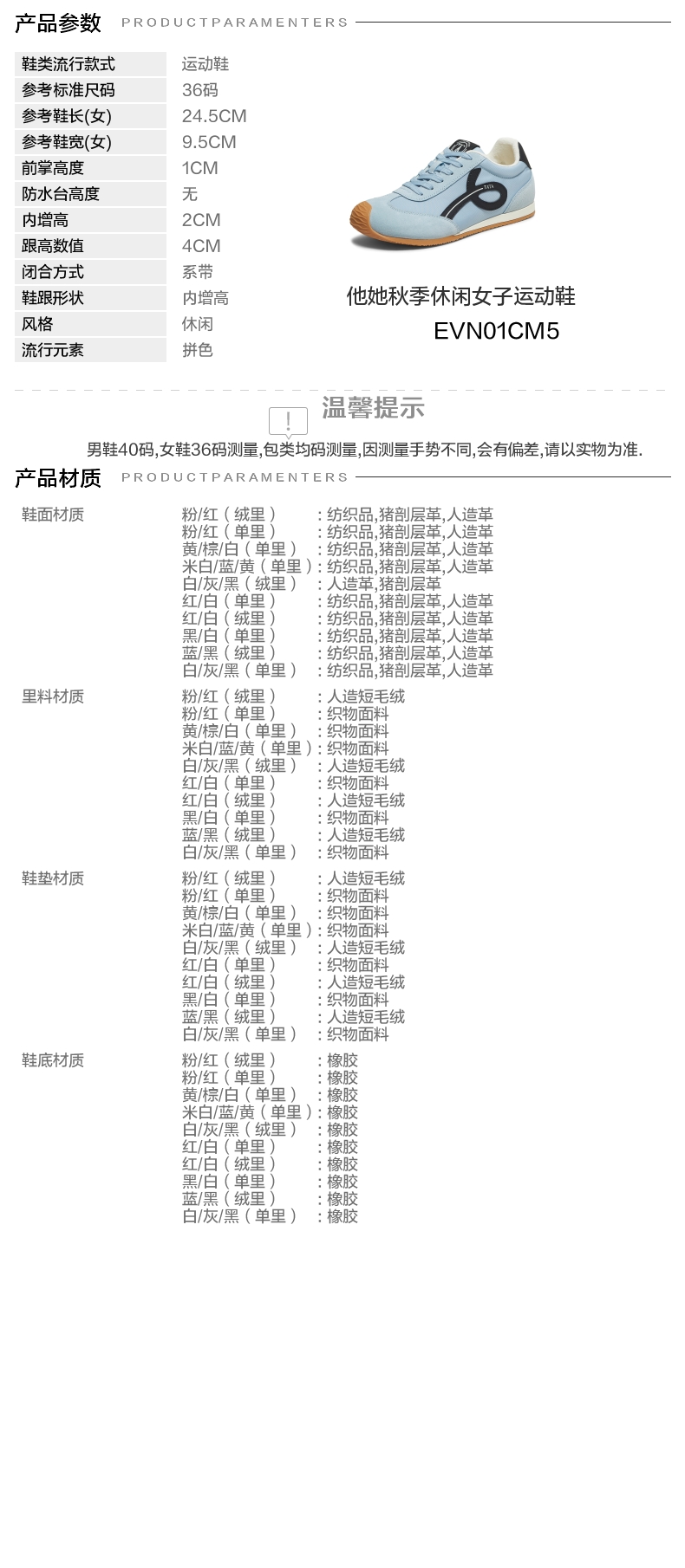 | 鞋跟形状:内增高 | 参考鞋长(女):24.5CM | 流行元素:拼色 | 参考鞋宽(女):9.5CM | 风格:休闲 |
