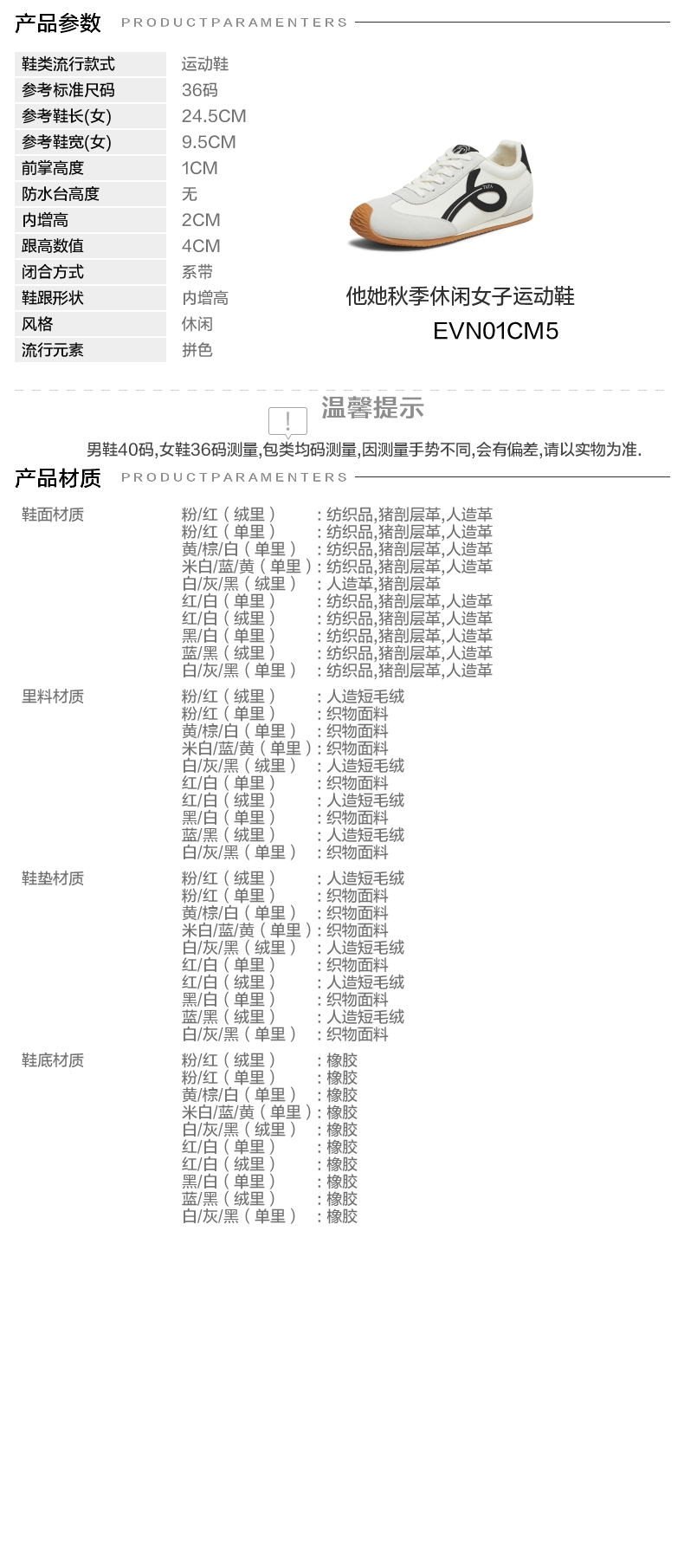 | 鞋跟形状:内增高 | 参考鞋长(女):24.5CM | 流行元素:拼色 | 参考鞋宽(女):9.5CM | 风格:休闲 |