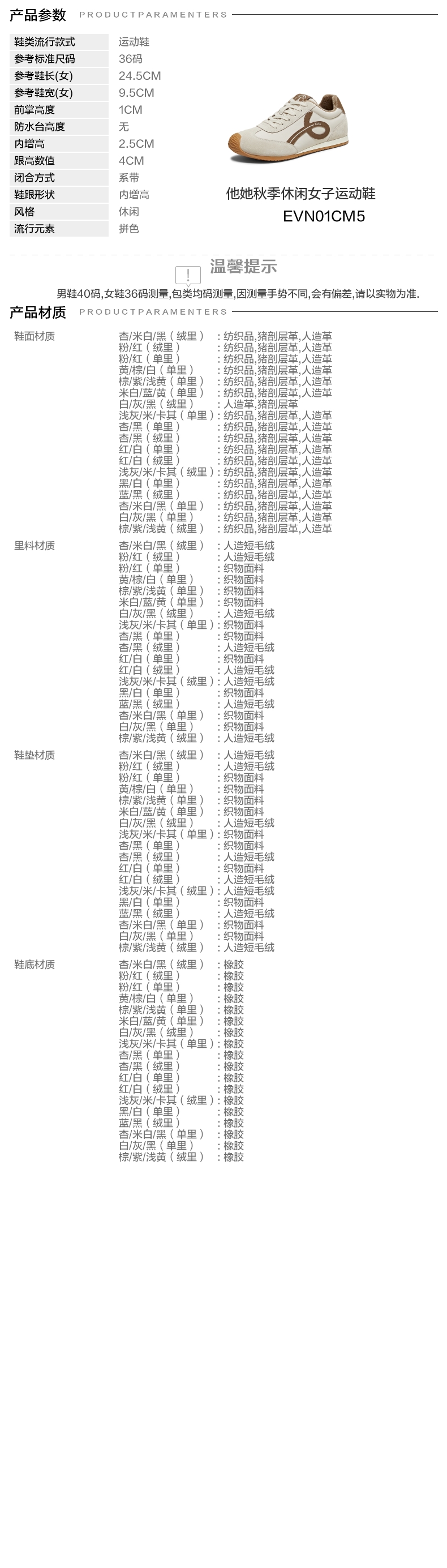 | 鞋跟形状:内增高 | 参考鞋长(女):24.5CM | 流行元素:拼色 | 参考鞋宽(女):9.5CM | 风格:休闲 |