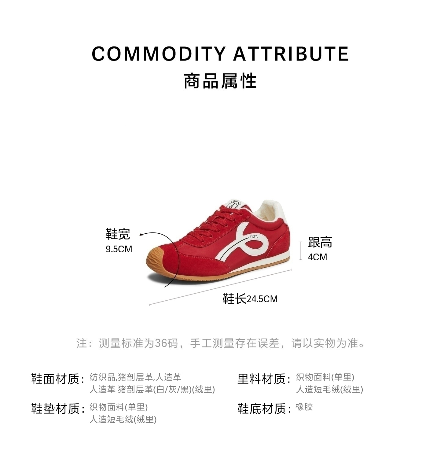 | 鞋帮:低帮 | 鞋底材质:橡胶 | 内增高:2.5CM | 鞋面材质:人造革猪剖层革纺织品 | 闭合方式:系带 |