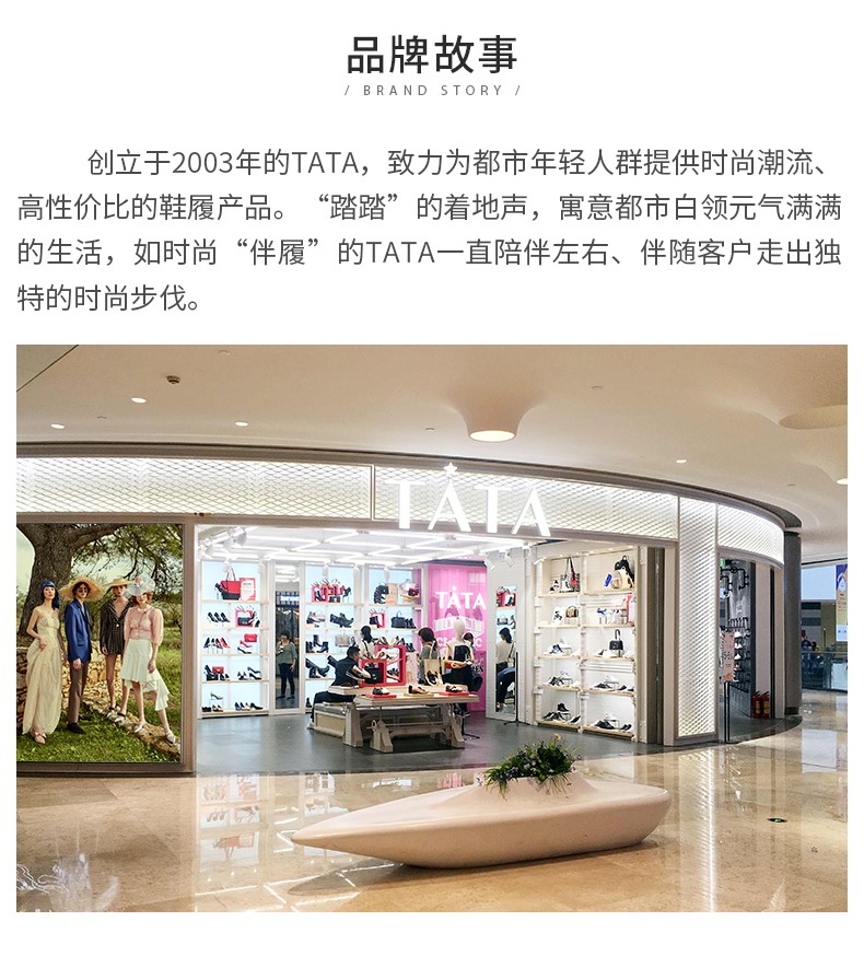 他她(Tata),品牌成立于2003年,致力为都市年轻人群提供时尚潮流、具有性价比的鞋履产品。十五年来“踏踏”的着地声,寓意都市白领元气满满的生活,如时尚“伴履”的TATA一直陪伴左右、伴随走出TATA的时尚步伐。2017年TATA美丽蜕变,TATA STAR元素的加入预示品牌将成为闪亮、前端的时尚鞋履品牌。