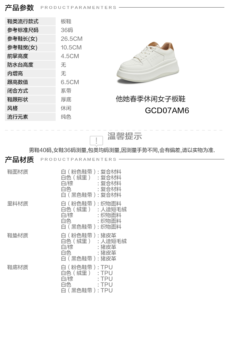鞋跟形状:厚底 参考鞋长(女):26.5CM 流行元素:纯色 参考鞋宽(女):10.5CM 风格:休闲