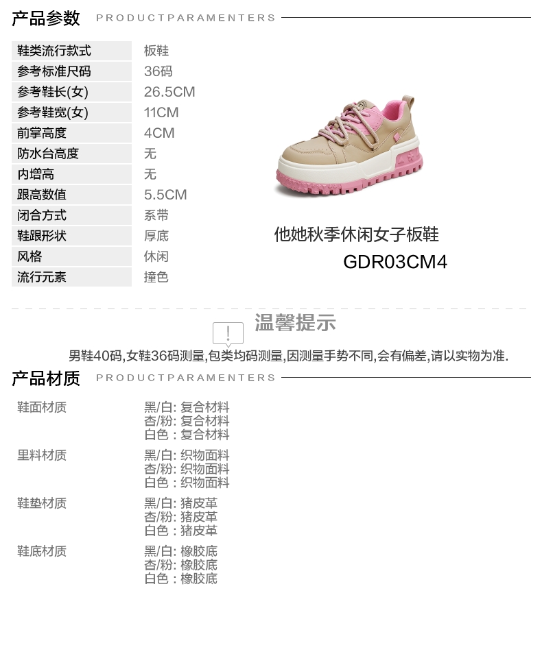 | 鞋跟形状:厚底 | 参考鞋长(女):26.5CM | 流行元素:撞色 | 参考鞋宽(女):11CM | 风格:休闲 |