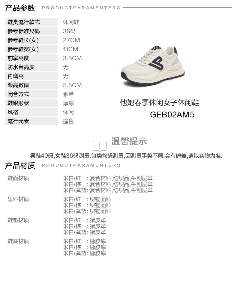 | 配跟:有 | 上市时间:2025年春季 | 鞋类流行款式:休闲鞋 | 鞋头款式:圆头 | 鞋面图案:拼色 |