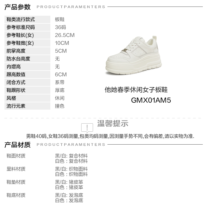 鞋帮:低帮 鞋底材质:发泡底 内增高:无 鞋面材质:复合材料 适用场合:日常休闲