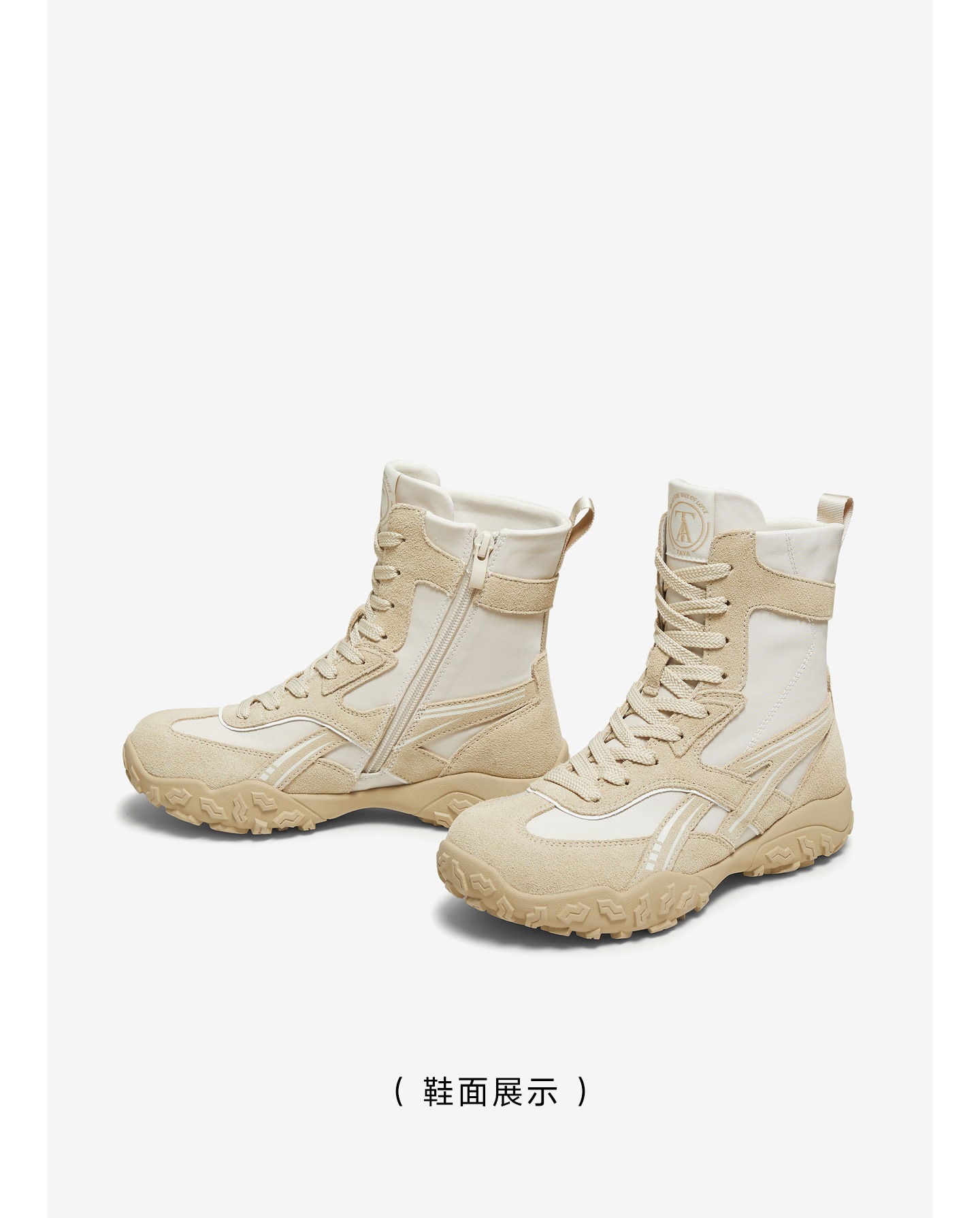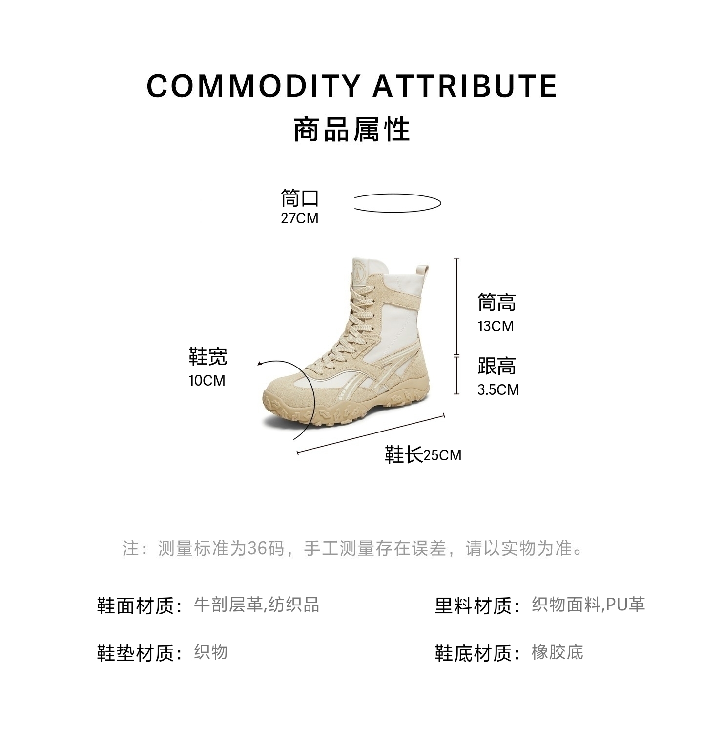 | 鞋底材质:橡胶底 | 靴筒内里材质:PU革织物面料 | 内增高:无 | 鞋面材质:牛剖层革纺织品 | 闭合方式:系带 |