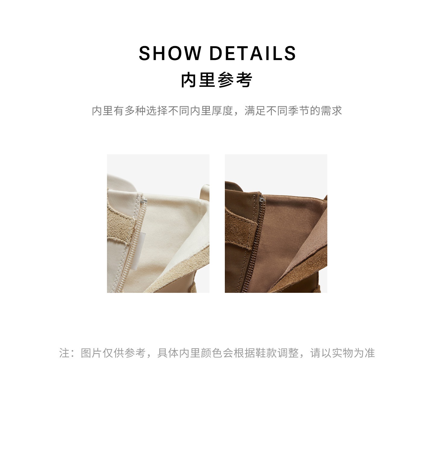 | 筒高数值:13CM | 靴筒筒面材质:织物牛剖层革 | 里料材质:织物面料PU革 | 制鞋工艺:胶贴皮鞋 | 鞋垫材质:织物 |