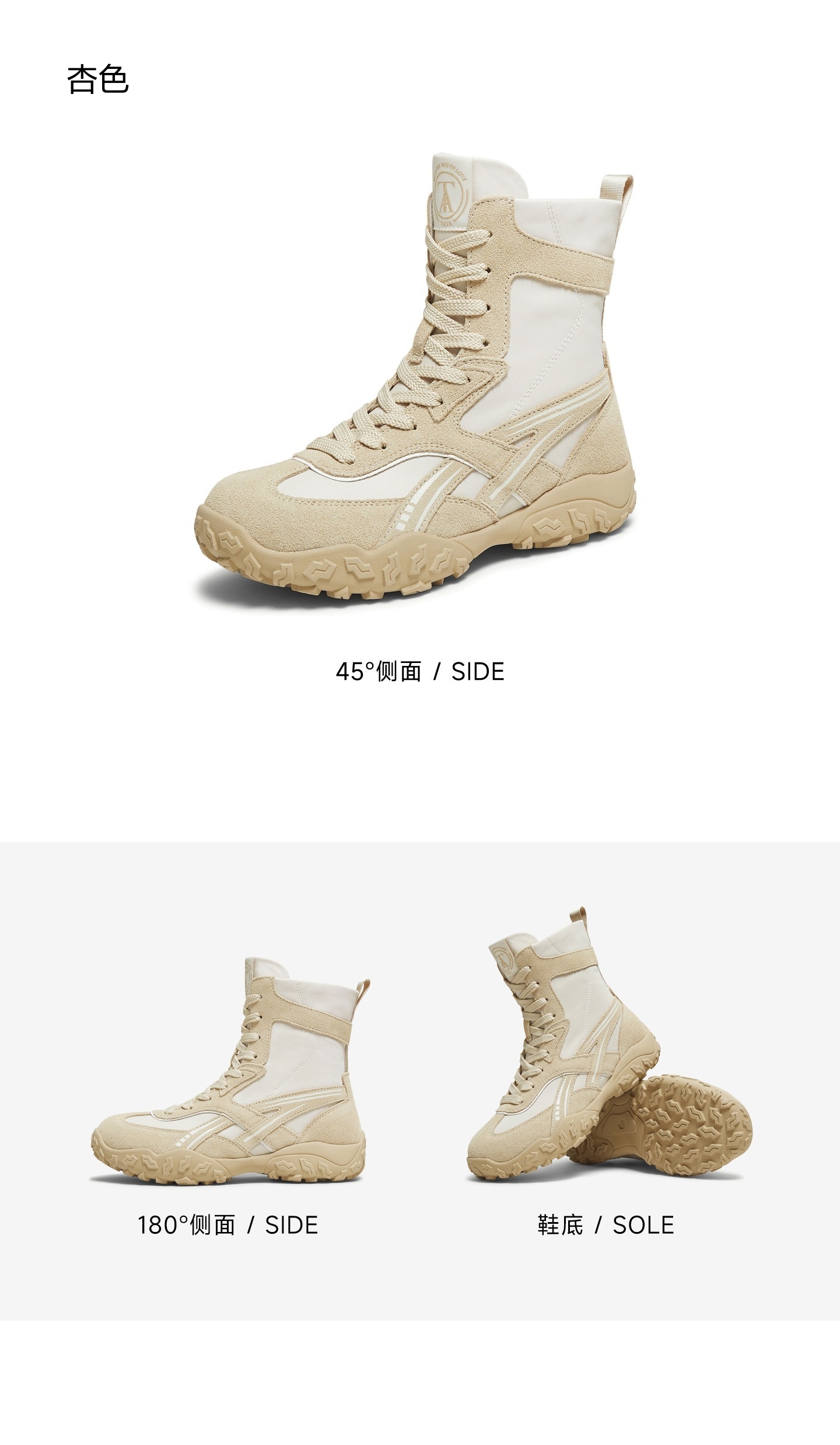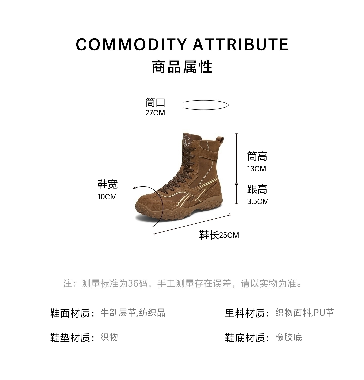 | 鞋底材质:橡胶底 | 靴筒内里材质:PU革织物面料 | 内增高:无 | 鞋面材质:牛剖层革纺织品 | 闭合方式:系带 |